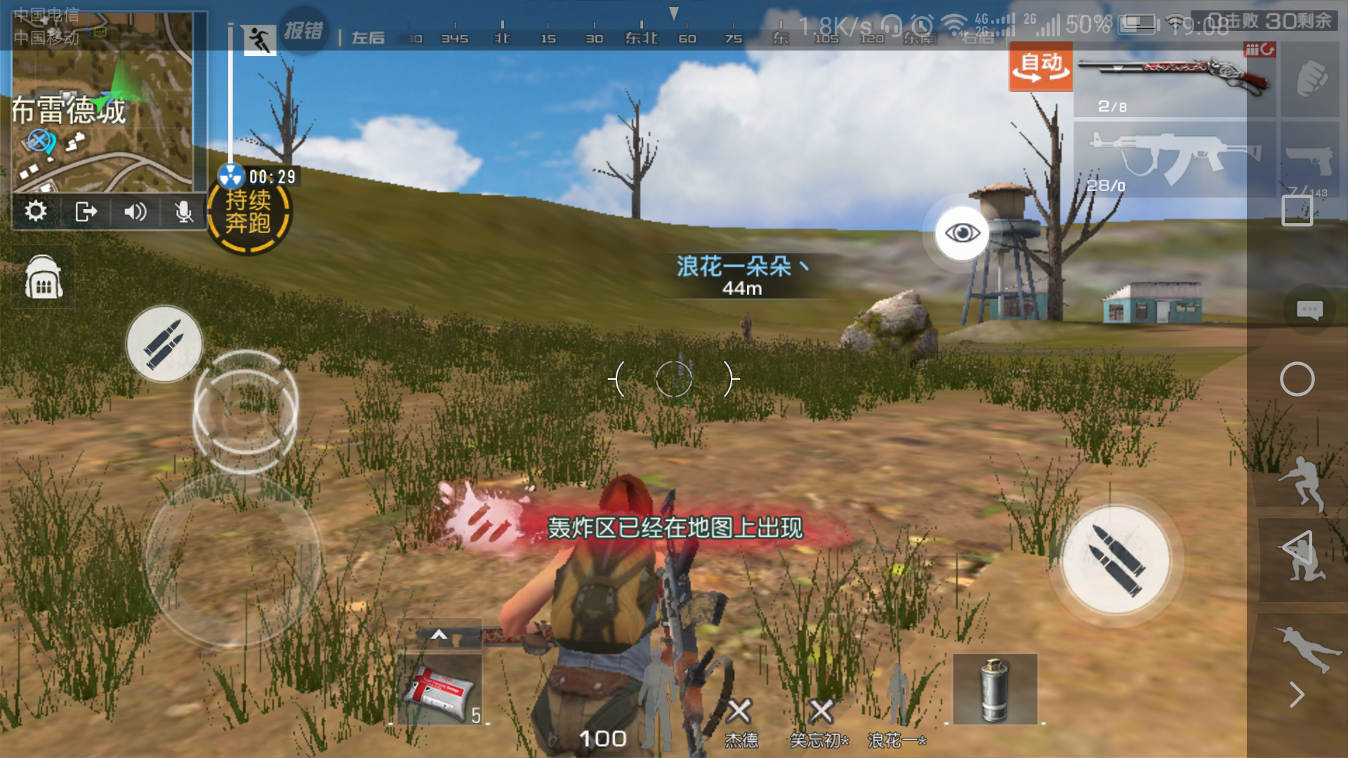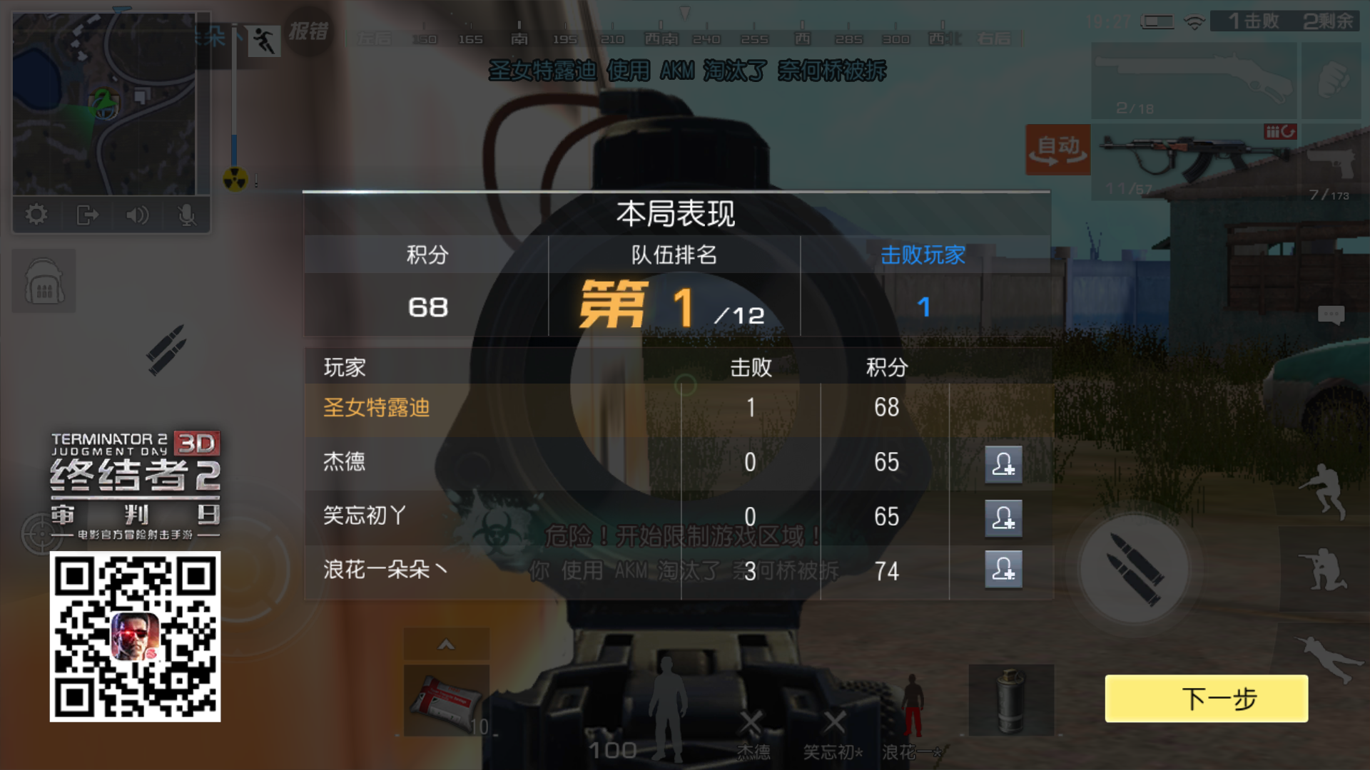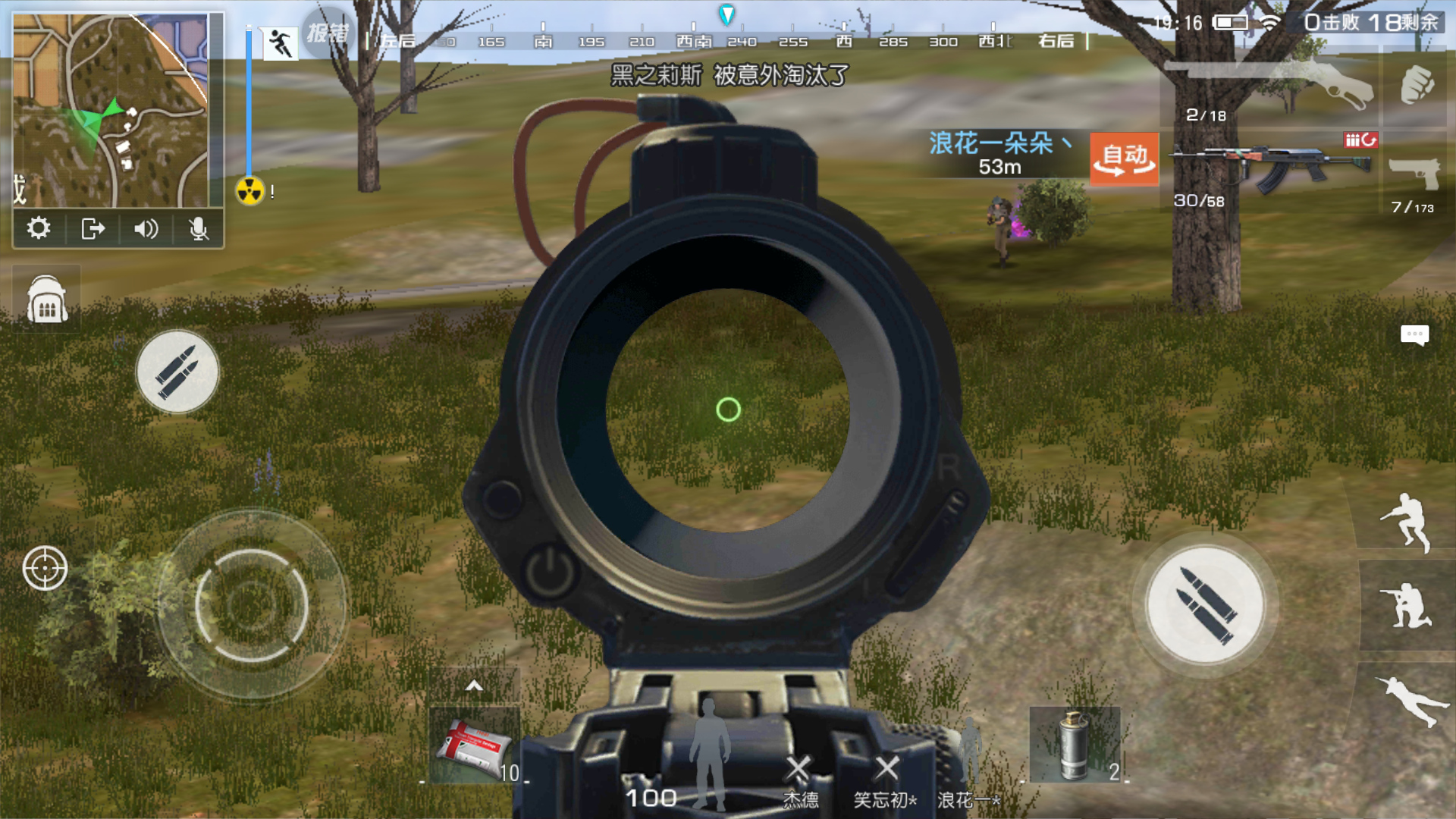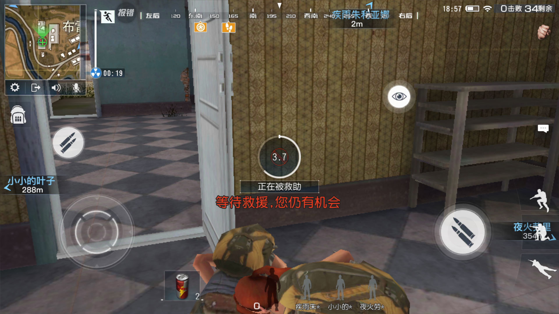 虽然安装包八百多MB,但游戏确实好。开了两把。 图一为第一局还不太适应不小心手抖把自己炸倒,经过漫长的等待,就差1s就流血死时被赶来的队友救起,但还是没活多久。 后面第二把开局死俩队友,队友被最后一个人打死,成功反杀,吃鸡成功。