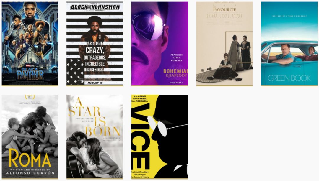 8部里边,《副总统》、《波西米亚狂想曲》还没来得及看,一个是克里斯蒂安·贝尔再现整容式演技,一个是整个摇滚圈的狂欢。在余下6部里,笔者最喜欢的是《绿皮书》,工工整整,四平八稳,其他几部虽然都有闪光点,但《黑色党徒》故事弱了点、《宠儿》题材不对口、《罗马》缺了点话题性、而《一个明星的诞生》都已经不是弟弟而是玄孙(翻拍第四版)了。