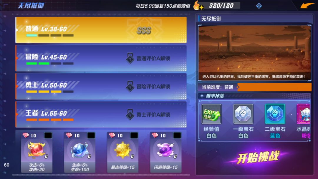 玩家等级到达38级时可以解锁活动副本“无尽抵御”,可从活动选项中选择进入副本,副本分为普通、冒险、勇士、王者四个等级,每一个难度评价到达A以上时则可以解锁下一难度副本,难度越高的副本也会有更多的阶段(普通级只有一个阶段),副本奖励当然也会随着难度的提升而提升。