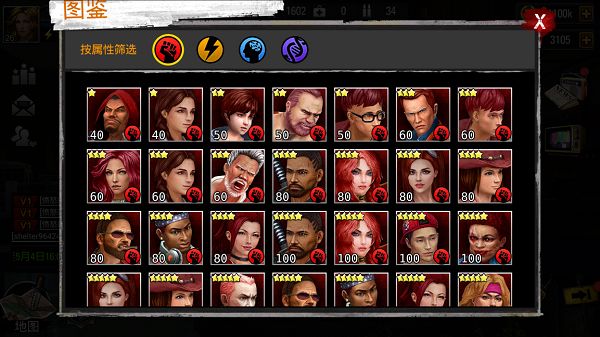 幸存者列表界面中的“图鉴”按钮点击后,出现图鉴列表界面;该界面可以按属性进行筛选和排序,界面中会显示所有的幸存者;