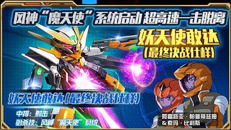 妖天使敢达(最终决战仕样)为罕见的由阿雷路亚和索玛双人驾驶的敢达。本机搭载了魔天使模式。在同时启动“哈利路亚”·“阿雷路亚”‧“皮里斯” 3个OS时,即会发动。此模式状态下,隐藏的独眼会露出来,变成6眼的令人畏惧的姿态并将机体性能大大提升至界限以上。