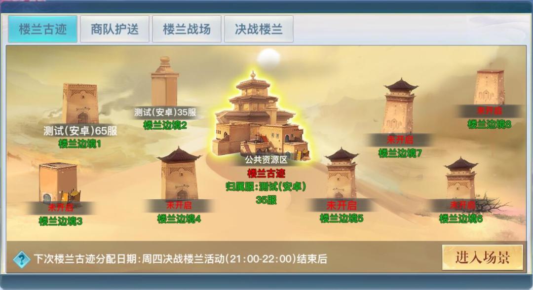 全新跨服地图·楼兰古迹,分为公共区地图【楼兰古迹】和8个【楼兰边境】。玩家等级达到150级可进入跨服楼兰,跨服楼兰三大玩法为商队护送、楼兰战场和决战楼兰。