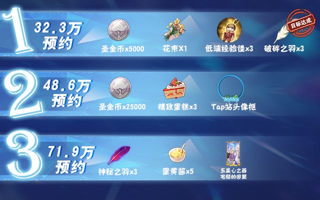 48.6万预约:圣金币*25000 精致蛋糕*3 Tap站头像框*1