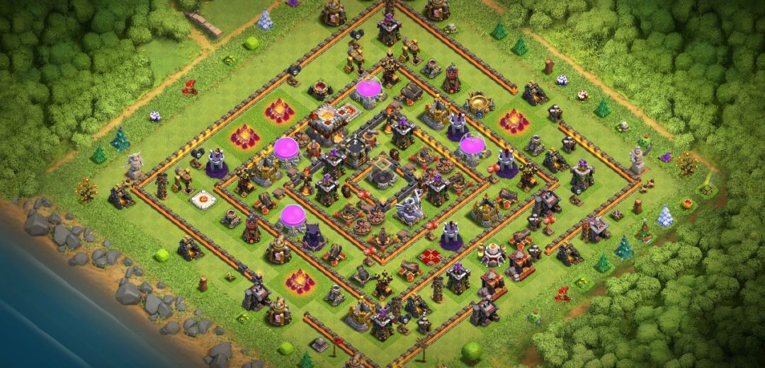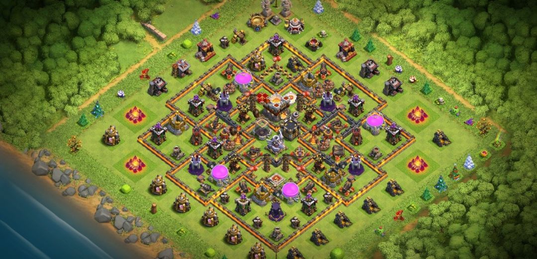 第三款阵型是一个多层引导阵,从内到外根据围墙能划分为四层,最外围的围墙并不是封闭的,有很多间隔,这对炸弹人非常克制,能有效将其引入歧途,避免了敌军从防御不密集的角落进中,内圈城墙呈“回”字密闭分隔,引导效果非常强,一旦部队被引导转圈圈,则会被更内圈的防御集火,威胁大减。而针对高本常用的天女流,外围间隔处巨型炸弹和搜空地雷的放置对天使损耗很大,在损失天使后,天女前戏效果相信会大打折扣。在防空方面,防空火箭四角放置,尽管这会让防空火力不那么密集,但容易造成敌军狗与球的分离,对于雷龙流也有更强的消耗效果。