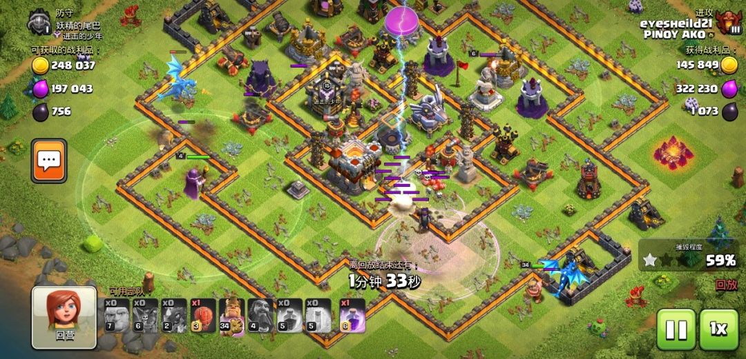 在防空效果上,防空火箭四角分布,空气炮内圈背对放置,再加上内圈的地狱塔和搜空地雷,给移速慢的雷龙和狗球造成了较大压力,对空军克制较大,引导性很好,常常能形成高摧毁率一星的战局,有效减少奖杯损失。