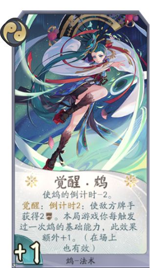 卡牌作用:抽1张卡牌的技能属于万用型卡牌,同时还能直接生效一次鸩的倒计时能力,尽量在倒计时刚好生效的时候使用,最大的利用倒计时的cd,觉醒后一下7-8破甲都是很正常的,高爆发与高吸血的支撑点之一,本身需要一点鬼火配合补刀或打脸式神,通常比较缺乏进攻性。不过就算无法触发去触发对方的破甲在前期也可以尽量去使用,一是为我们的觉醒增加基础层数,二是对于携带鸩的卡组来说前期过牌也是比较重要的。