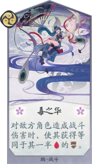 卡牌作用:简单说就是多打对面血量数值一半的伤害,同时也可以触发一次寂寥心象的效果,在三勾玉后可以对对方牌手或式神造成大量伤害,不过由于太后期一般不会带太多毒之华。和鸩目前的玩法整体来说不太贴合。