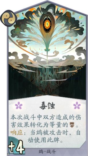 卡牌效果:战斗牌,响应牌,使用后本次鸩力量+4,本次战斗中双方造成的伤害效果转化为等量的破甲,响应:当鸩被攻击时,自动使用该牌。