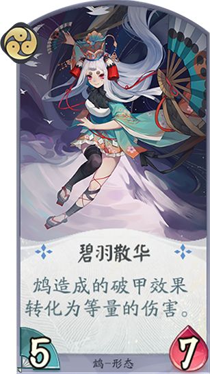 卡牌效果:形态牌,使用后鸩变为5-7,鸩对有破甲的角色造成的破甲效果转化为等量的伤害