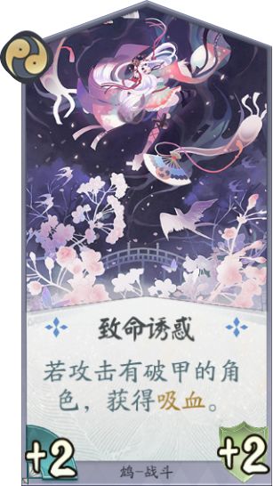 卡牌作用:特效比较独特的战斗卡,注意这次战斗是不会直接造成伤害的,伤害会转换成等量的破甲,在进攻时一般配合队友补刀用于清理对面高血量高攻击的式神,防守时可以利用致命诱惑来回血加解场,响应效果也可以在回合外保护鸩吸收伤害。要注意使用后鸩自己本身高量的破甲值会导致极容易被处理掉。