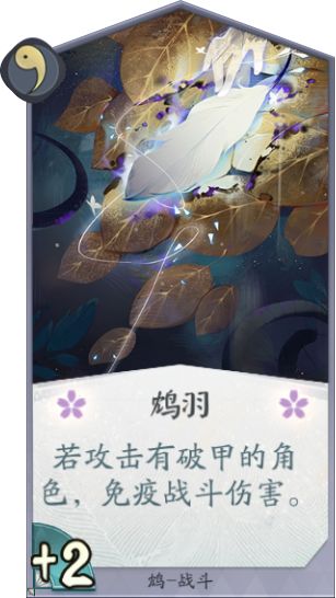 卡牌作用:鸩本身的力量并不高,前期鸩羽的打4加强了交换能力,中后期配合队友破甲的无伤效果也非常优秀,有点尴尬的是鸩自己只有一张毒蚀可以给式神破甲,总体来说还算是鸩可以考虑携带的卡牌。