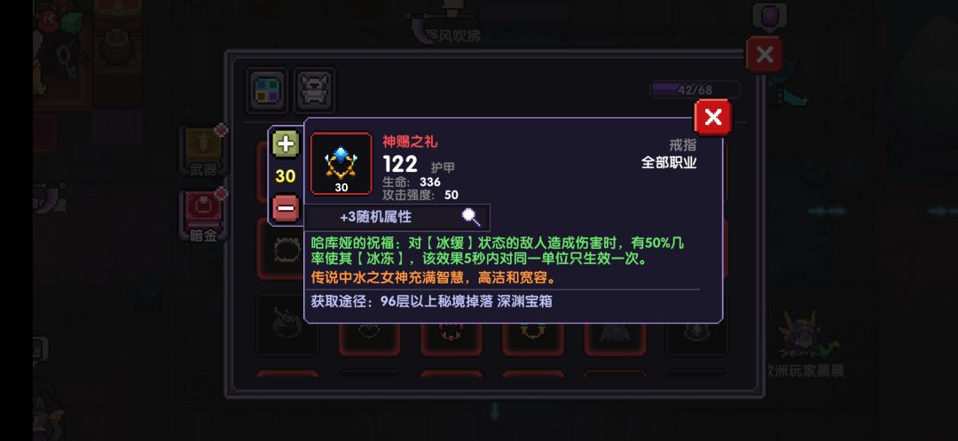 其次是次要装备神赐(冻住,不许走)固定小怪,虽然我觉得有冰盾就可以了,但是想到以后层数高了小怪血高单纯的冰盾的时间可能不够杀掉小怪剩下的就是个人搭配了,我把我搭配的分享出来,提供参考