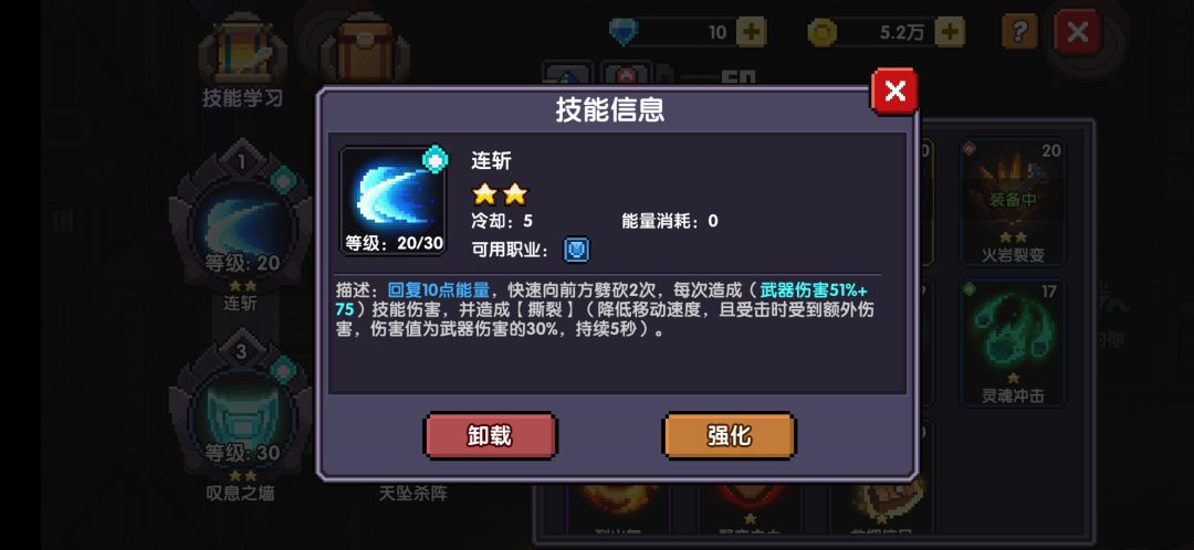 连斩:回复10点能量造成俩次伤害,附加(撕裂)效果:降低移动速度,受击时受到额外伤害,伤害为武器攻击的百分之30,持续5秒