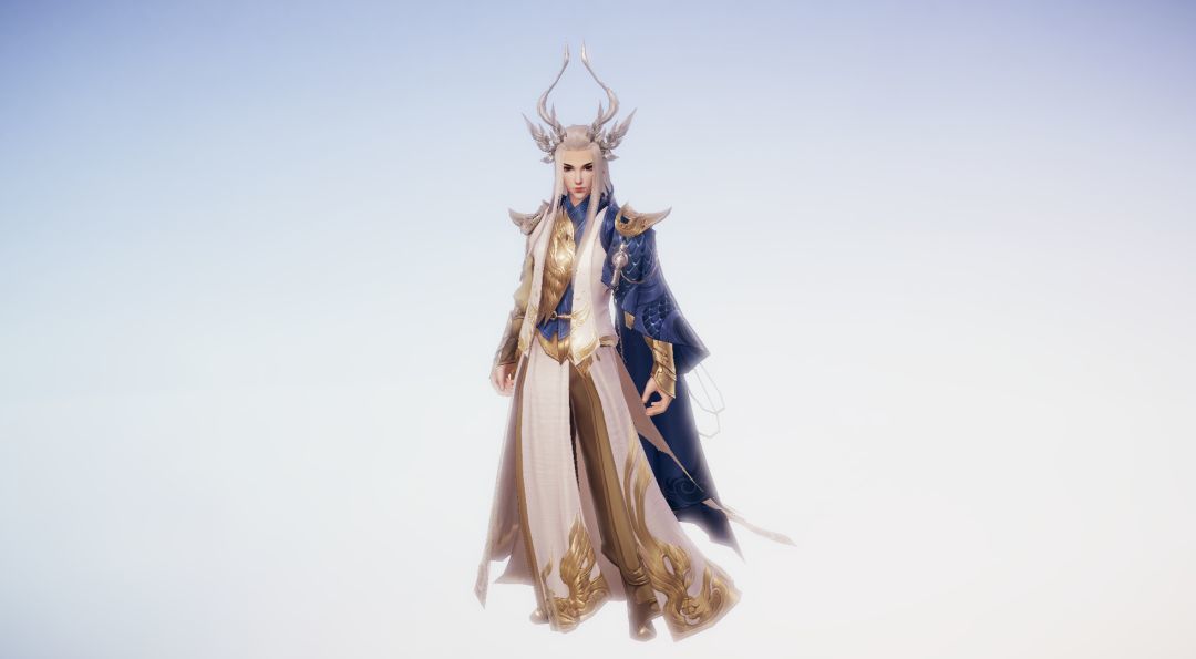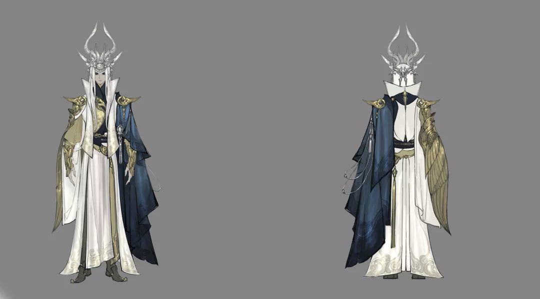 袖饰凤羽,金鳞覆胸,头戴象征尊贵与威严的银色头饰,以暗金、靛蓝、和珠白为主色调。女子穿着为开叉长裙,后有金色尾羽,透露着不可逼视的雍容华贵。