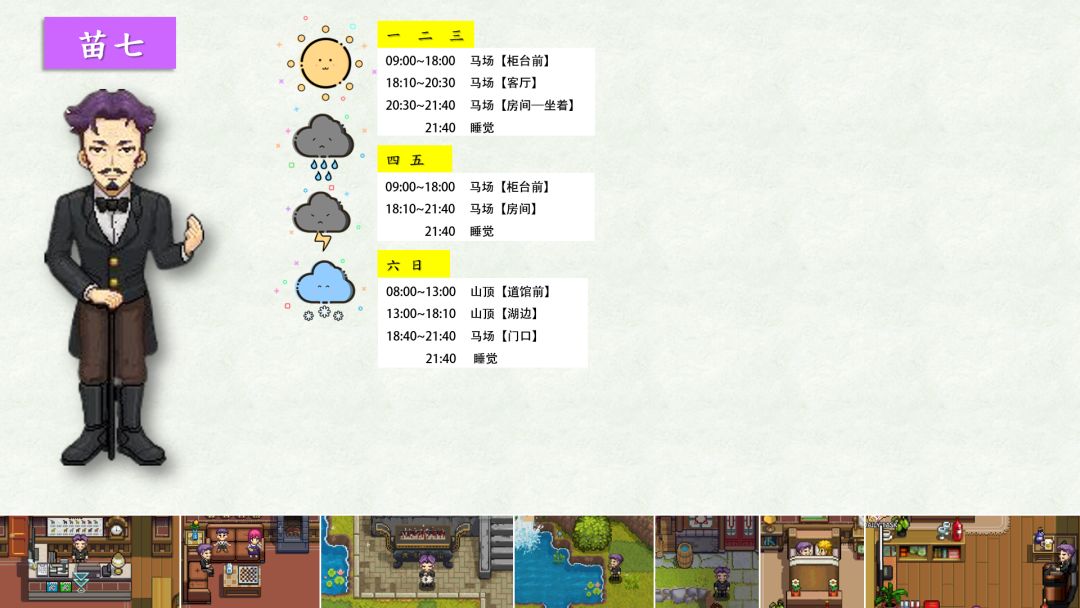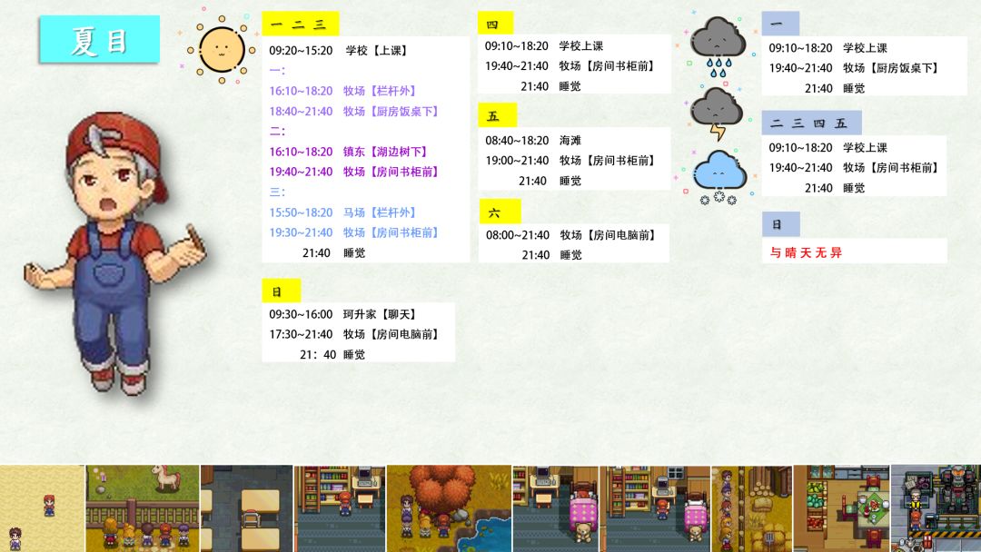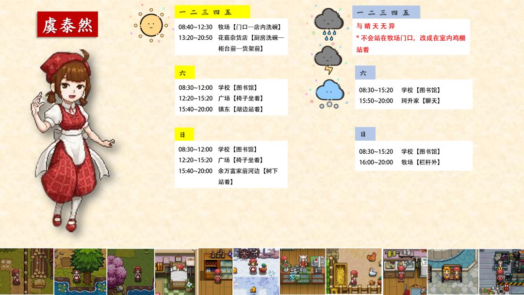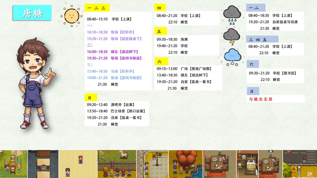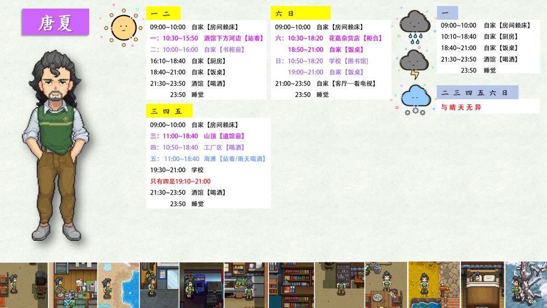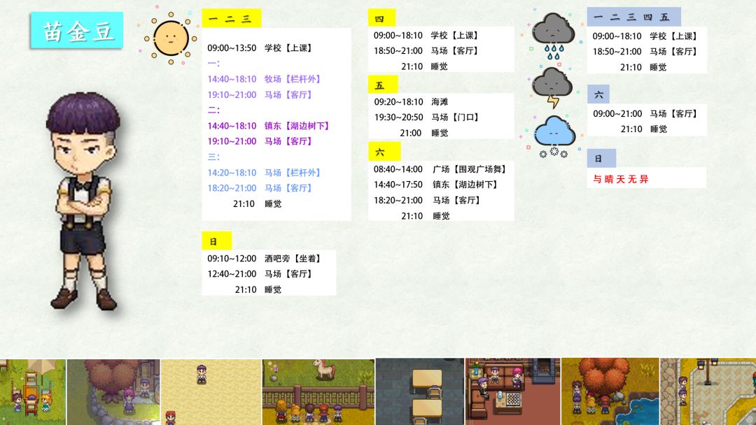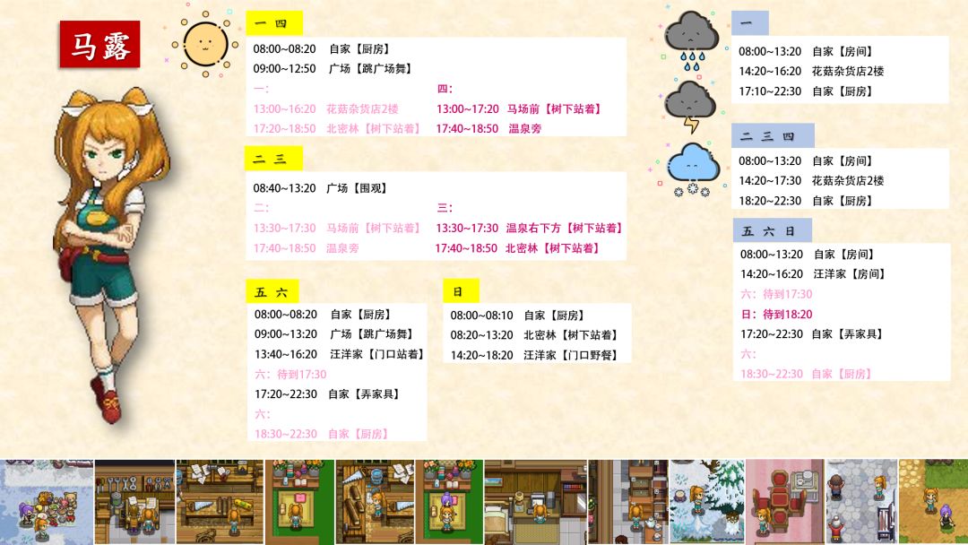 跟踪了很久,加上校正,终于将奶牛镇全村民(共32位)的每日行程写好了!!