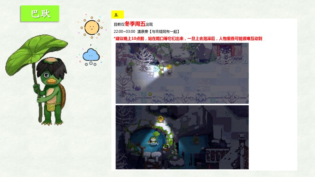 ⚉20/12/2019 看了官方发布的视频,后续估计会加入节日或者其他玩法,故NPC行程会一直被官方修改。因此,等完善了我再更 或者 我勤劳了再更新此贴。