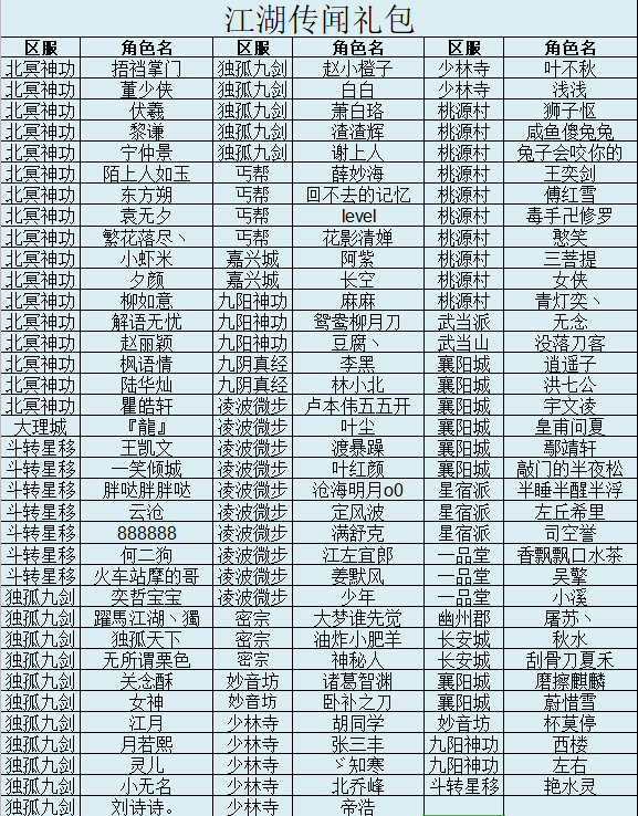 以上就是获得我们的【江湖百晓通】礼包的少侠名单,当然没猜对的少侠们也不要难过呀~只要参加本次论坛活动,都会有一份【江湖传闻】礼包送上,以下便是获得【江湖传闻】礼包的少侠名单~