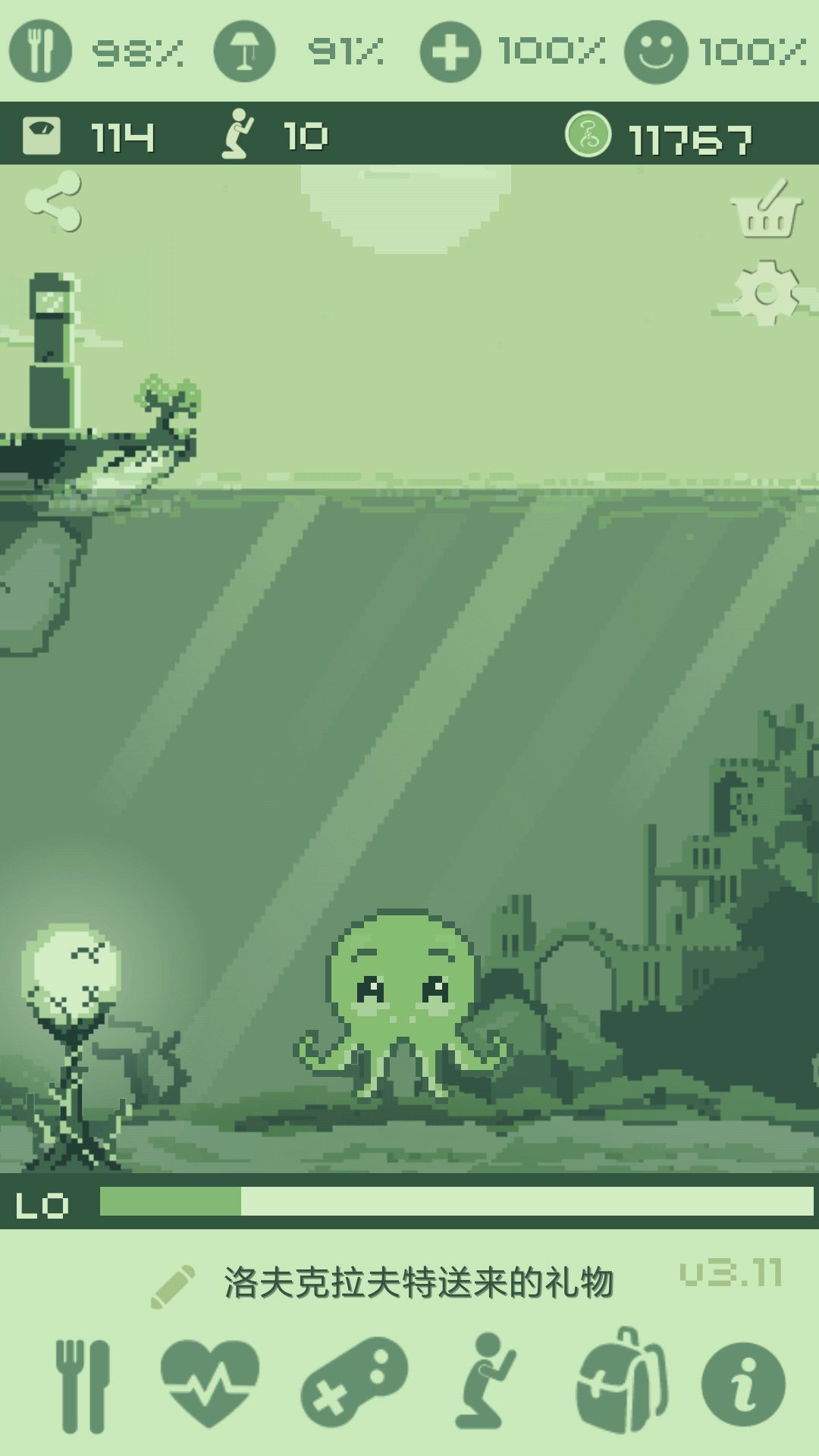 眼看着它越长越胖却不长个头,我只好想办法让它运动起来。有时候是带它破坏城市,击沉海上的大船,有时候是让它帮忙造梦。我记得有一天,我本来睡得正香,突然噩梦袭来,吓得我一整晚都没敢睡觉,后来我明白其实是克苏鲁干的好事,我就喂了它一星期的小鱼当做惩罚。好在它也没记仇,不然回想起来我的命都不一定能留。