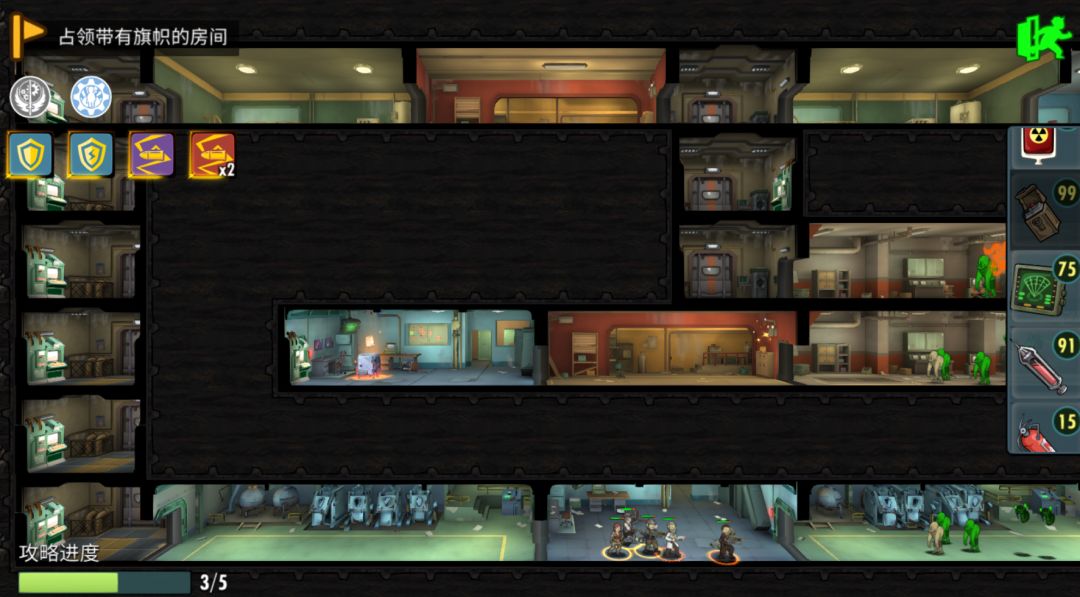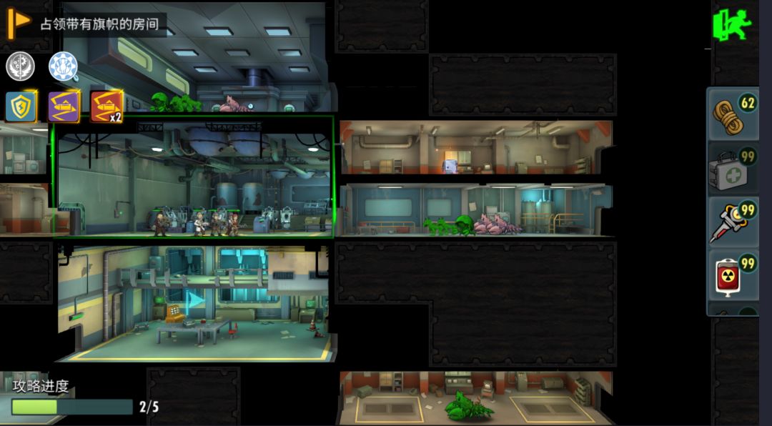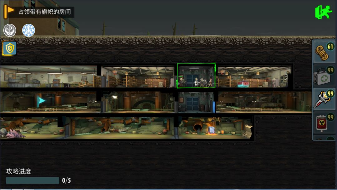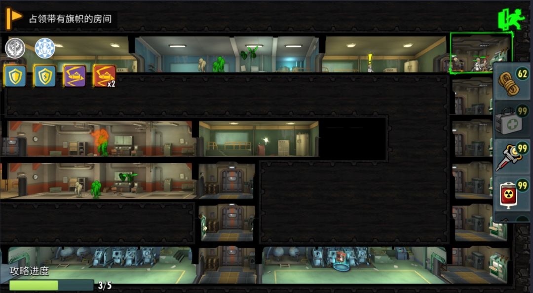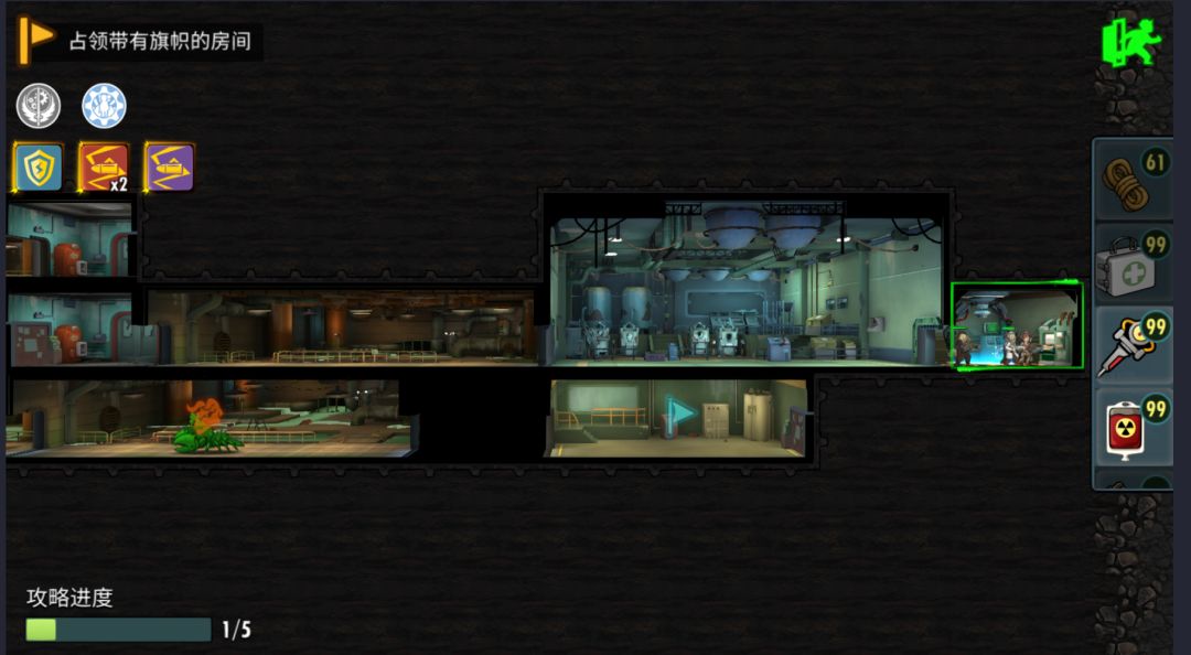 第一层3组小怪,无辐射,2个加成,没有什么难度和要点,想速通就直接吊绳子近占领房间。