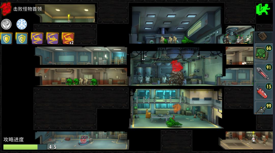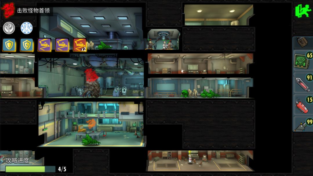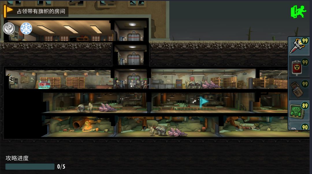 第四层的占领房间为未探测的黑色小房间。第四层的怪辐射怪居多,对前,后皆可造成辐射伤害。全通的必经之路由大僵尸把守。想速通的可在清理一波小怪后绕行到右下电梯最高处,吊绳子进入占领房间的前一间,在进入占领房间。