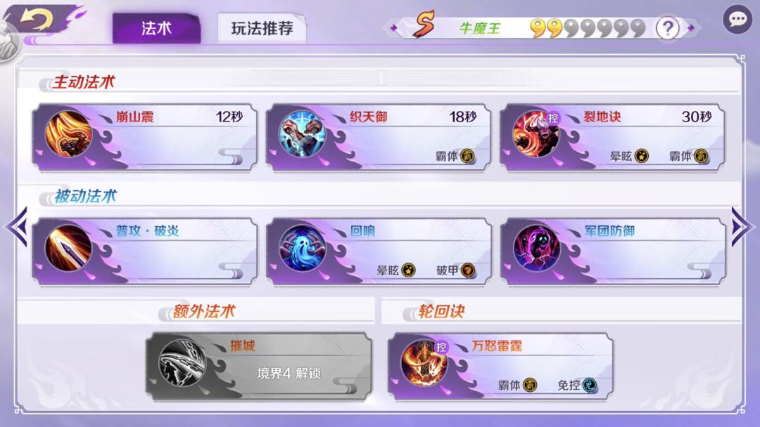 细心的玩家可能已经发现藏在缘神法术界面中的小秘密,有一个灰色的额外法术处于锁定状态并提示玩家需要缘神达到境界4才可以解锁。境界是缘神达到一定条件之后进行综合实力提升的强力玩法,因为境界的提升将会影响缘神几乎所有能力的全方位提升。境界的提升需要满足炼丹等级、队伍等级、缘神等级、法器等级等四个方面的要求,每一次提升对缘神的实力提升都是非常明显的。而随着境界的提升,当其达到4阶之后便可解锁强力的额外法术,助力你在战斗中更加游刃有余。