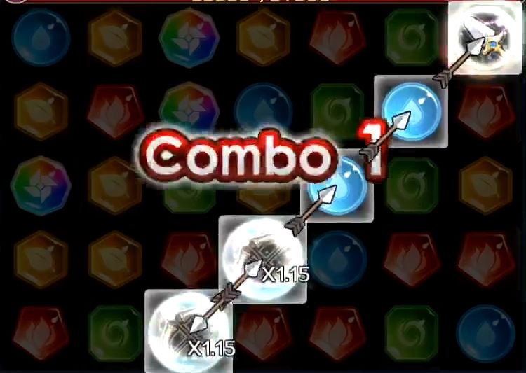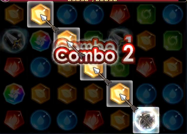 在无法利用爆珠来引爆另一爆珠的打到2combo的情况下,只有同时将2颗箭爆珠连入序列是最好的选择,就像这样: