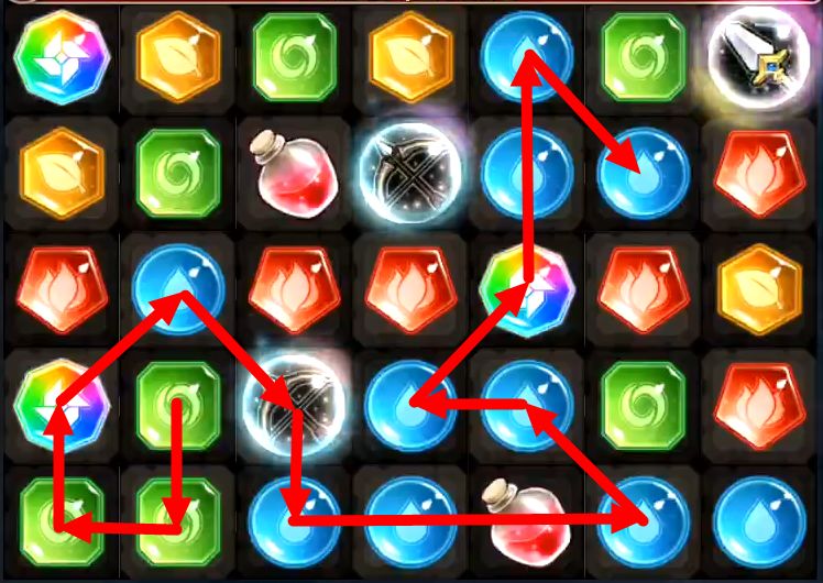 这种经常能够遇到,能在连接最多珠子的情况下,再把两个箭爆珠都连进去,无疑是能够最大化连珠数的。就像这样: