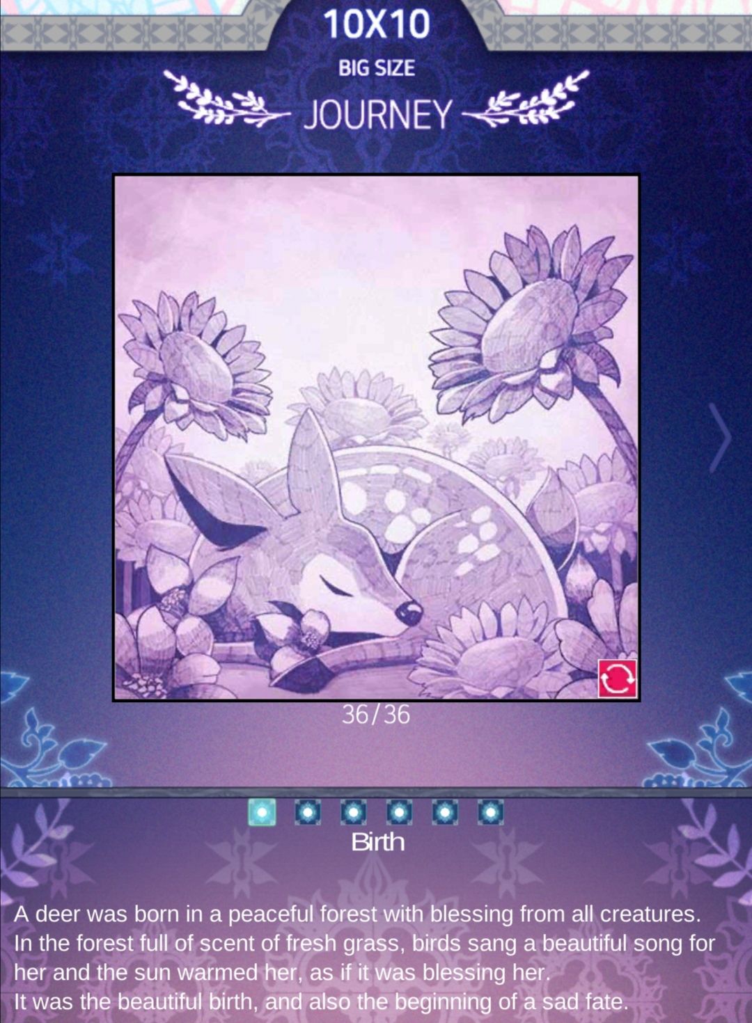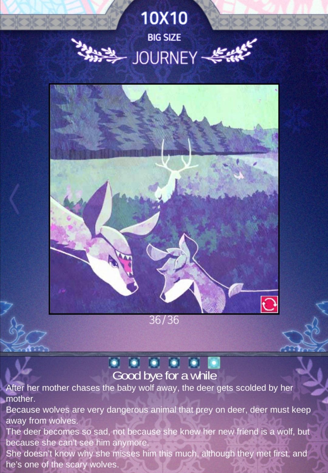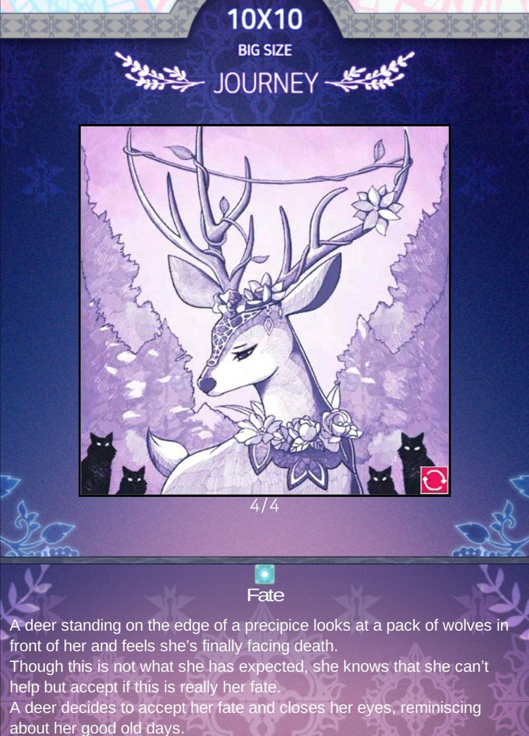 站在悬崖边上的一只鹿看着面前的一群狼,感觉自己终于要面对死亡了. 虽然这不是她所期望的,但她知道如果这真的是她的命运,她只好接受.鹿决定接受她的命运,闭上眼睛,回忆她过去的美好时光.