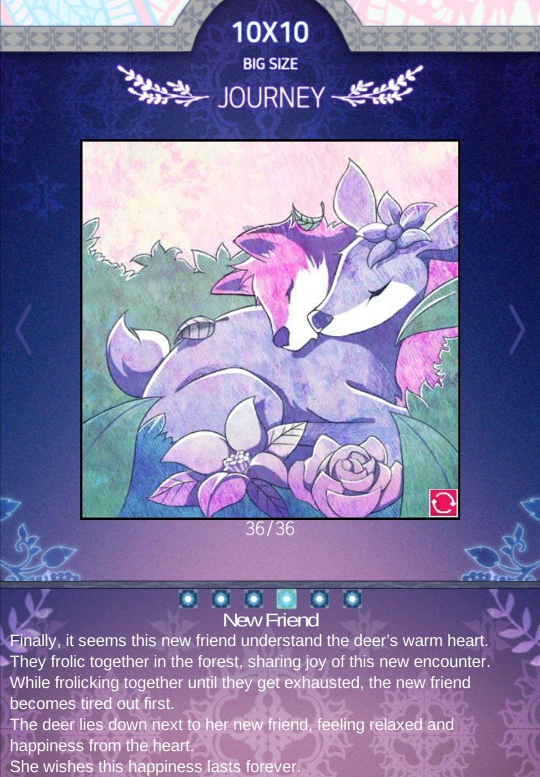 新朋友终于明白了,鹿有一颗温暖的心,他们一起嬉戏,一起分享新的相遇的喜悦,一起嬉戏,直到筋疲力尽.新朋友累了,小鹿躺在她的新朋友旁边,心里感到轻松和幸福,她希望永远这样幸福.