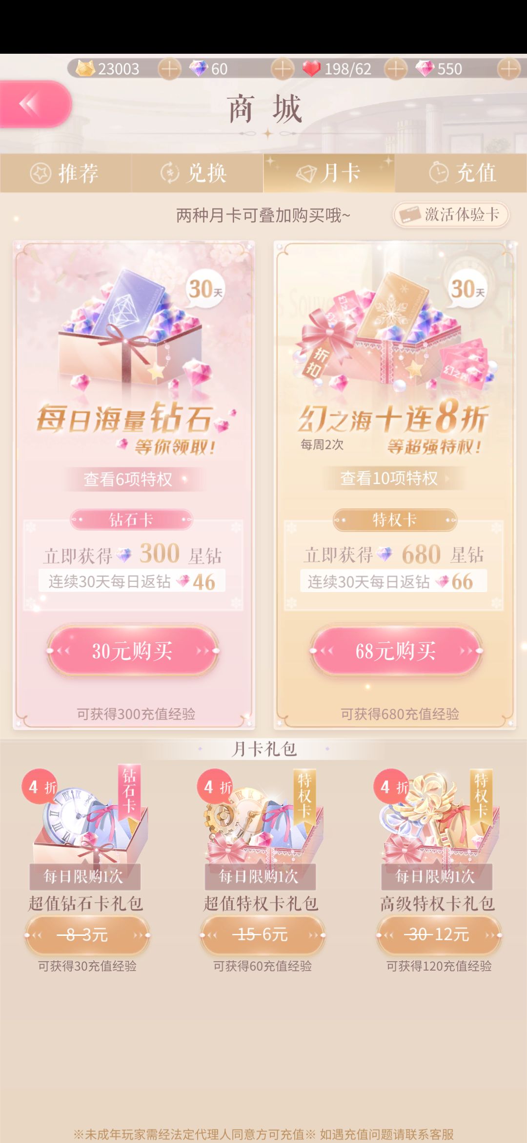 首先是两种月卡+活力特权卡,而且这个活力特权卡非常坑爹,6rmb=7天。换句话说如果想无缝连接的话,一个月至少是4×6=24rmb。