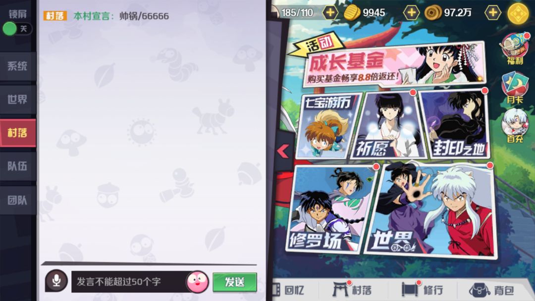 A:《犬夜叉-觉醒》手游里的社交系统十分丰富,聊天系统共包括【世界频道】、【好友私聊】、【村落】、【队伍】、【团队】和【全服广播】。