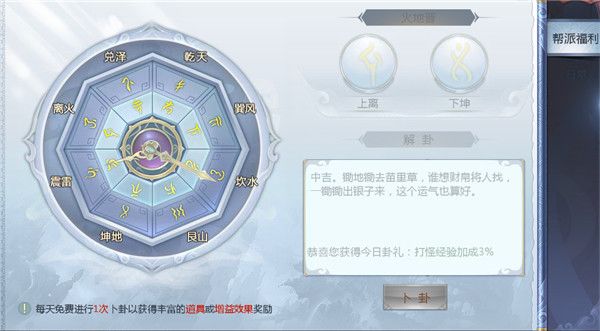 玩家加入帮派会获得帮派福利,每天免费进行1次卜卦以获得丰富的道具或增益效果。