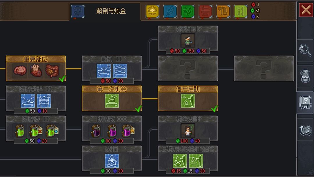 僵尸解锁方法:帮老蛇完成配钥匙的任务,然后去停尸房格里(会说话的骷髅)会触发剧情,之后再去地牢里就OK了。僵尸版本多出的技能树(如果你的游戏中没有这几个栏的话那应该就不是僵尸版本了,我的这几个技能还没解锁的时候也是有那几个栏的,也是和其它未解锁的栏一样是问号,等解锁后就会有图标了。):