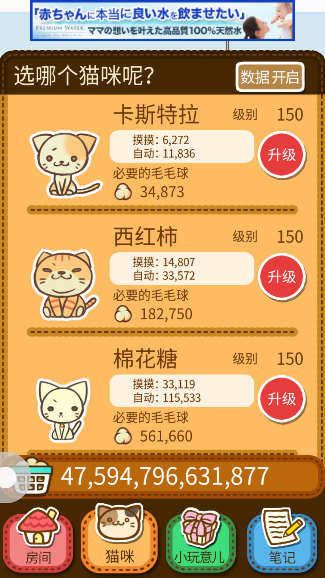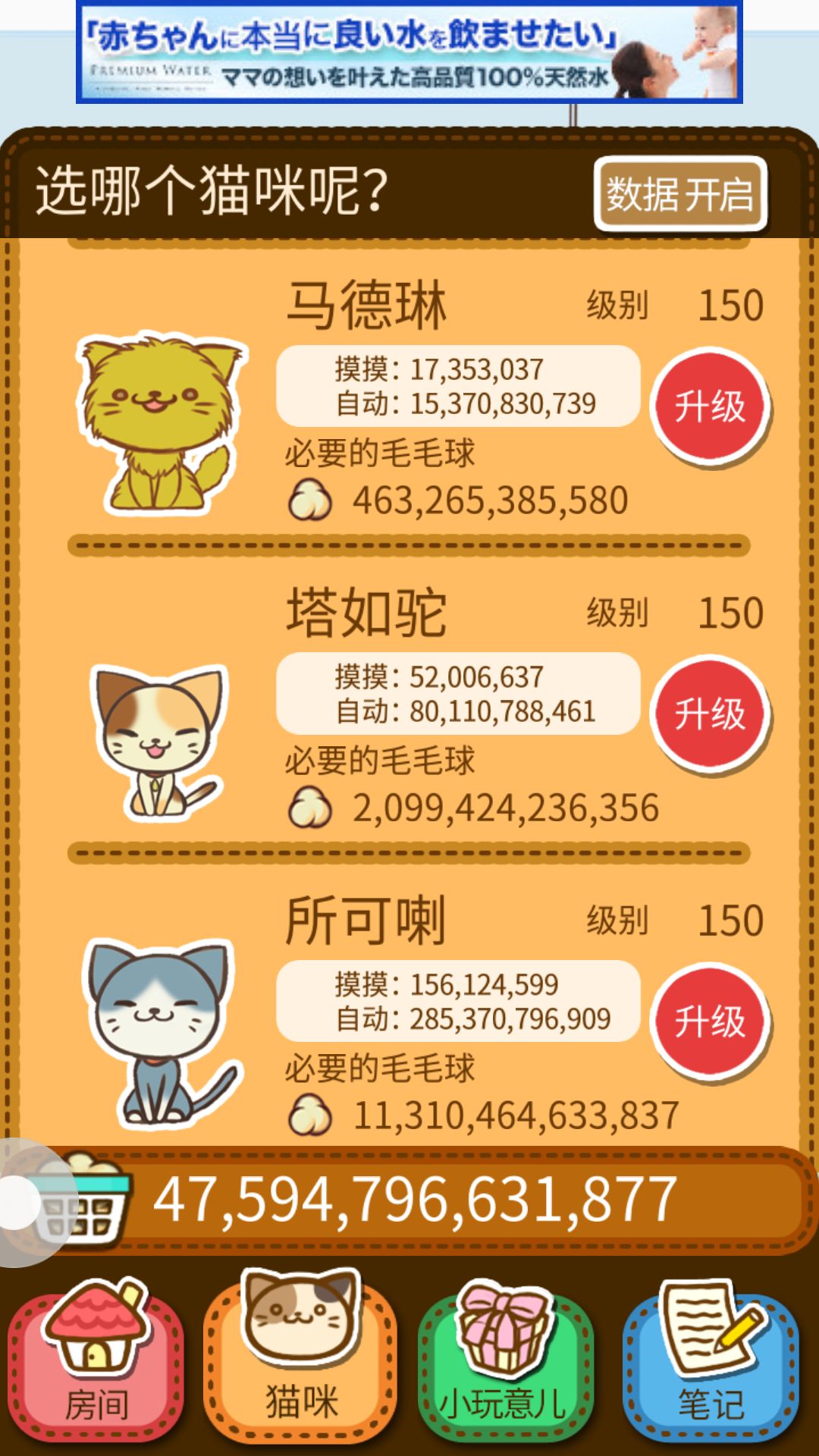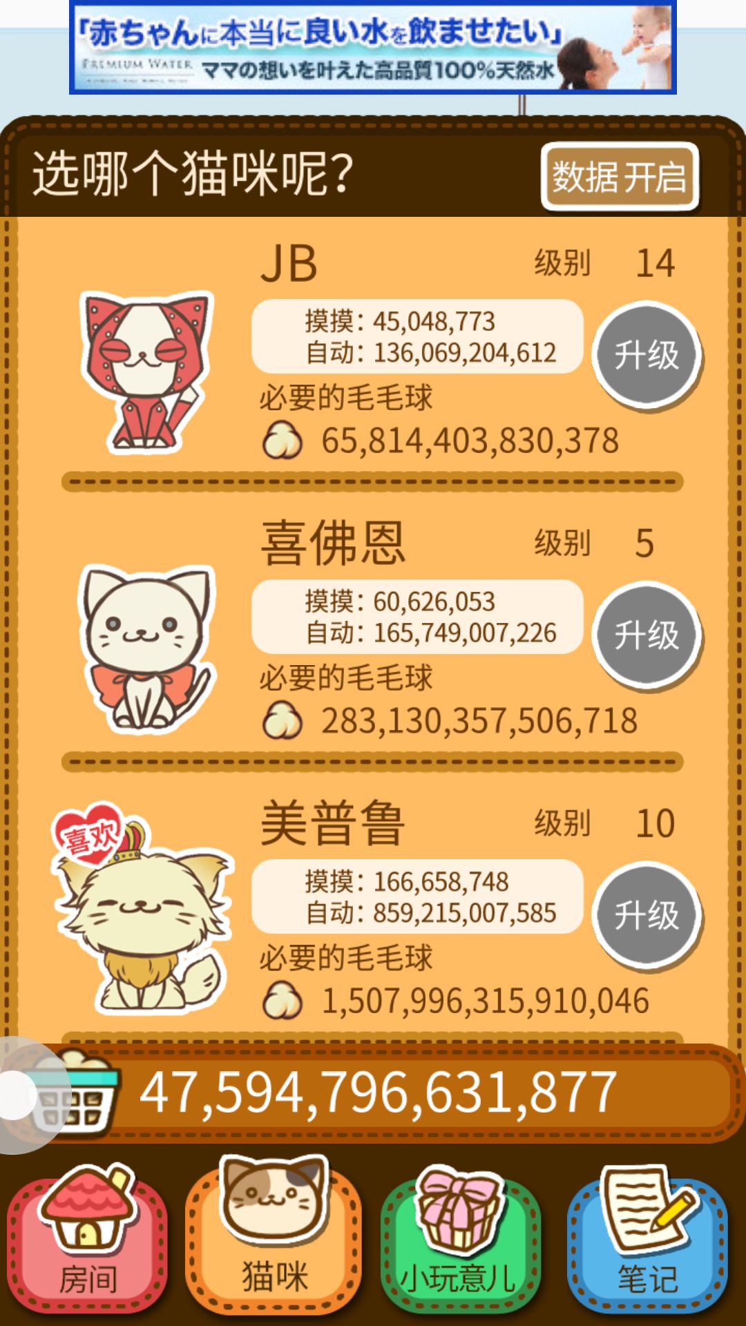 为什么要升级前面的猫咪?嘻嘻 当然是为了自动的毛 这是最划算的先开始都升级到70到100 小玩具也是升到80就可以停止升级了后面所得不多没用