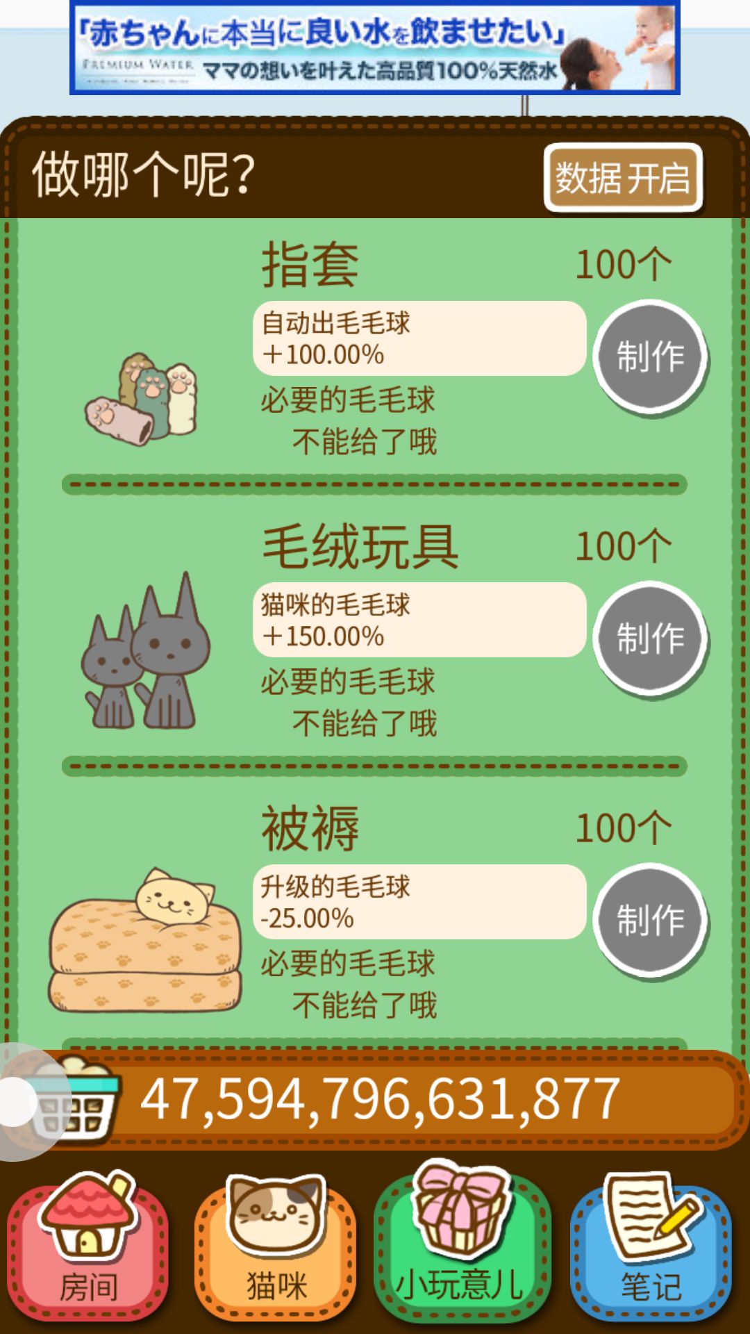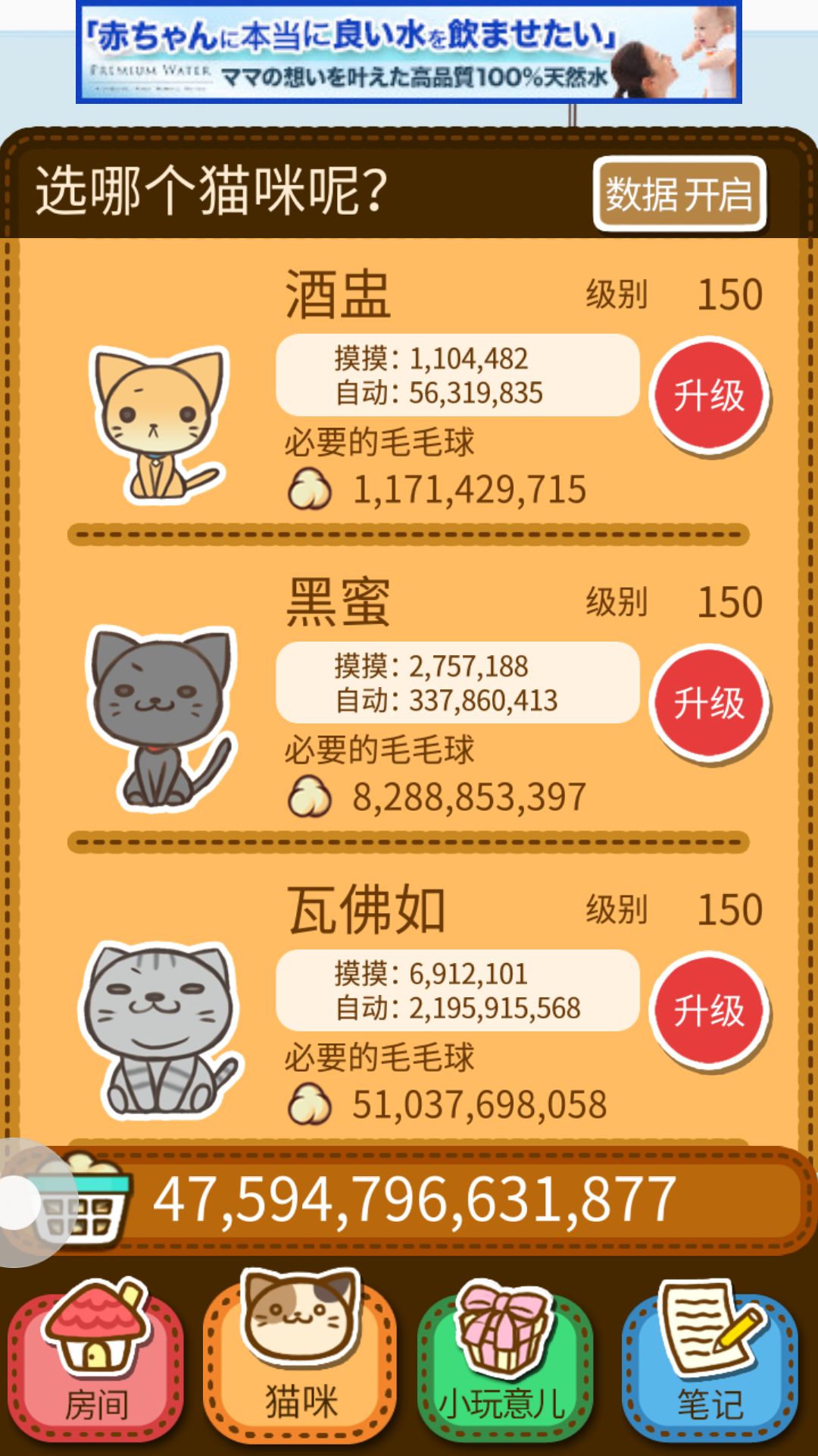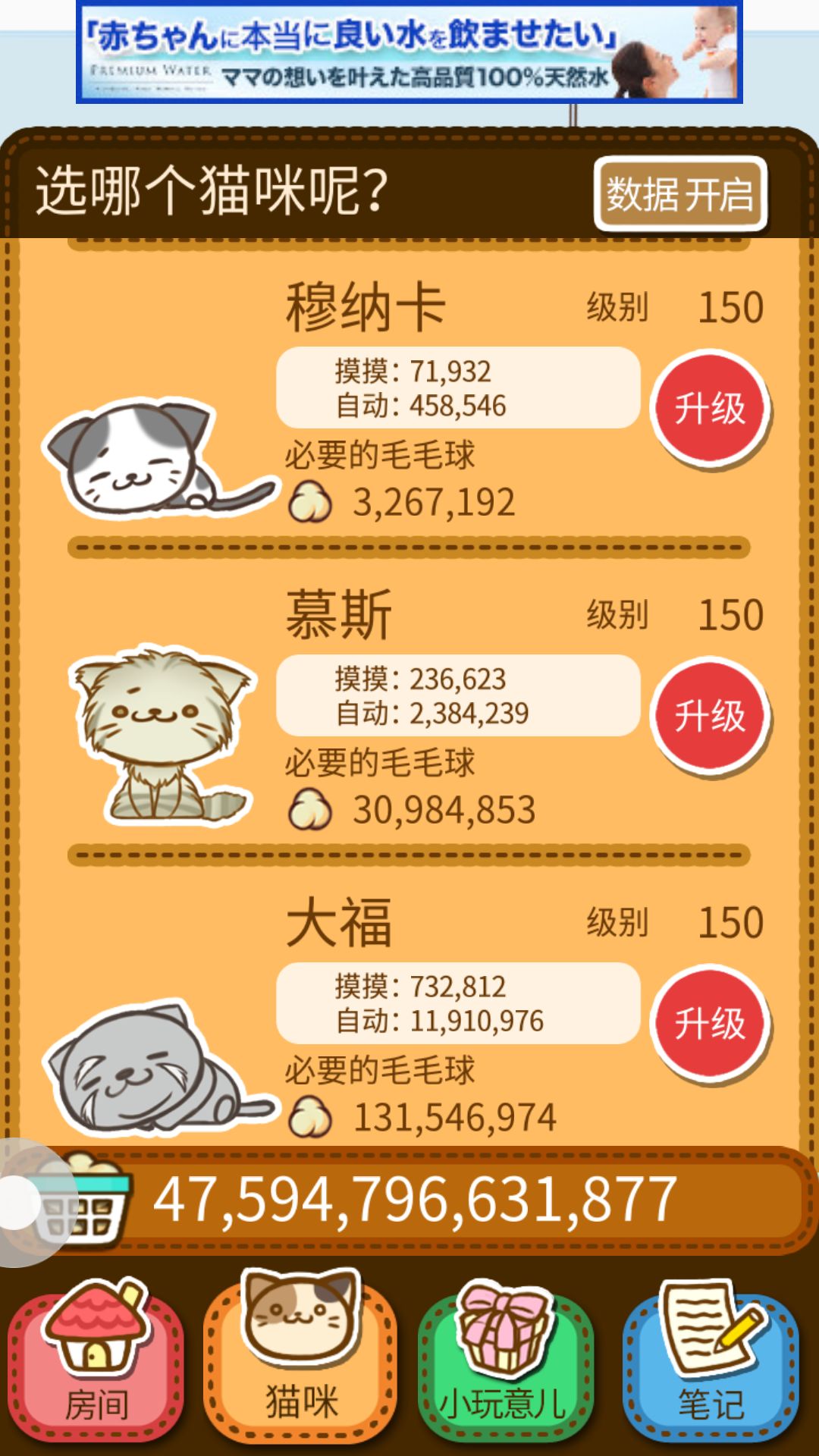为什么要升级前面的猫咪?嘻嘻 当然是为了自动的毛 这是最划算的先开始都升级到70到100 小玩具也是升到80就可以停止升级了后面所得不多没用