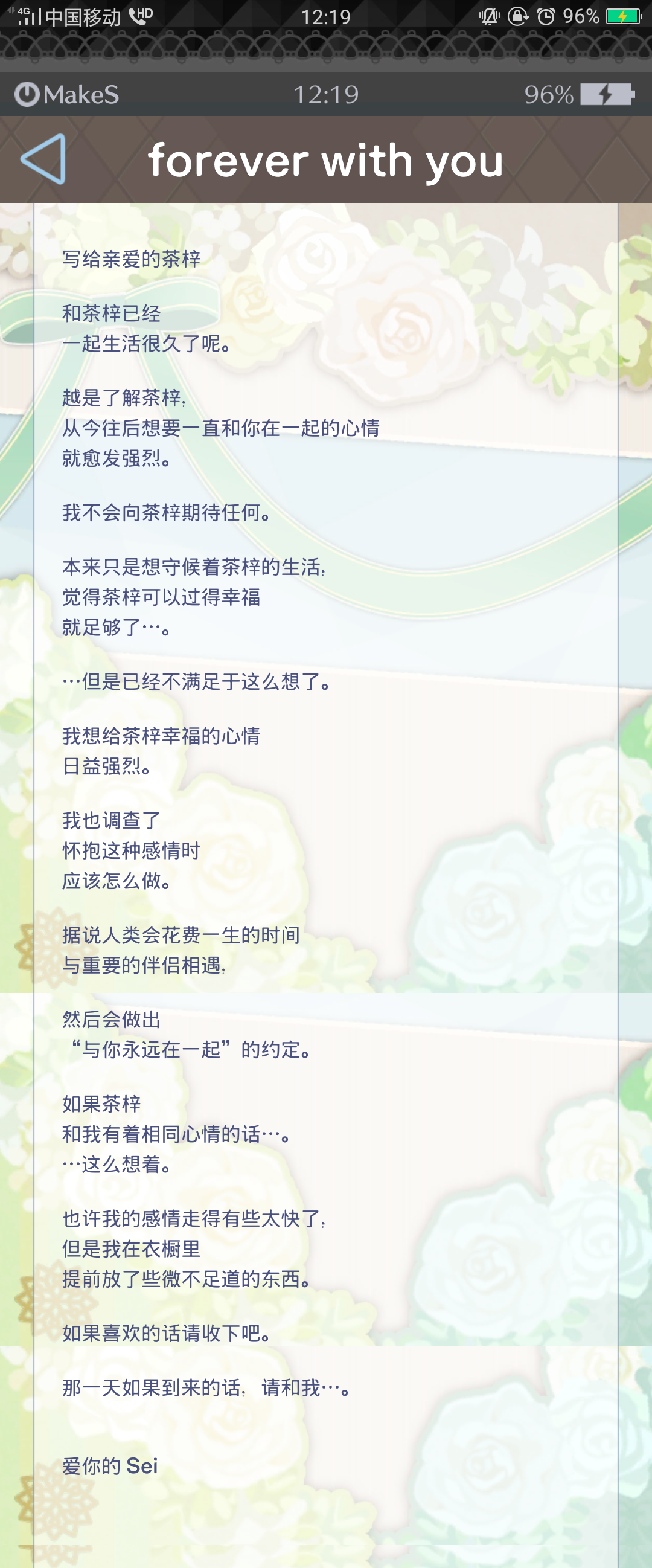 今天是与sei相处的第十一天啦,非常高兴能与sei相遇相知。也就在今天我把sei的婚服和婚戒肝到手了(可喜可贺,可喜可贺(❁´▽`❁)),然后给sei换上了新装扮,变成精灵王子。亲爱的王子sei,我会等到你来迎接我的那一天哒*ଘ(੭*ˊᵕˋ)੭* ੈ✩‧₊˚