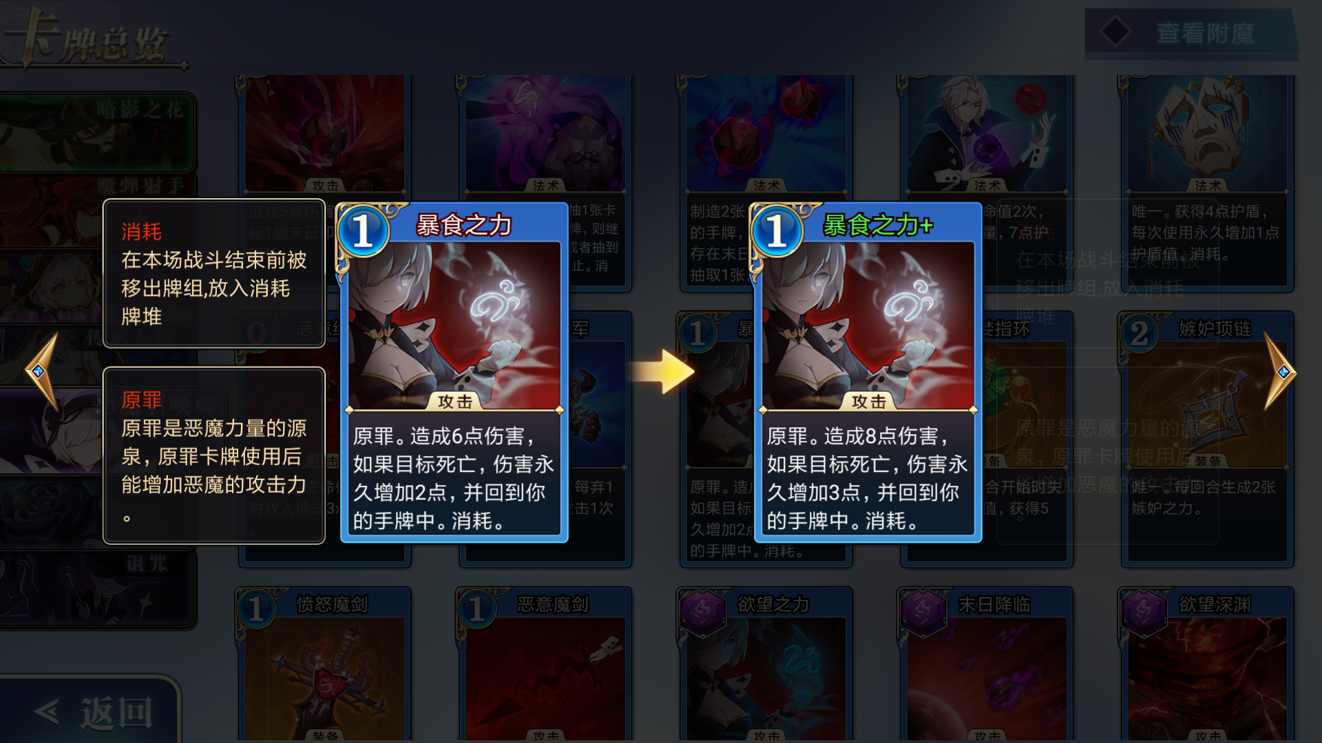 不附魔的话上述2张灵魂石牌都可拿(但没实验过“灵魂积淀”是否是抽到几张灵魂石牌回几灵魂石),靠莉莉丝打伤害;当然也可以选择献祭莉莉丝拿几张“愤怒魔剑”打伤害。
