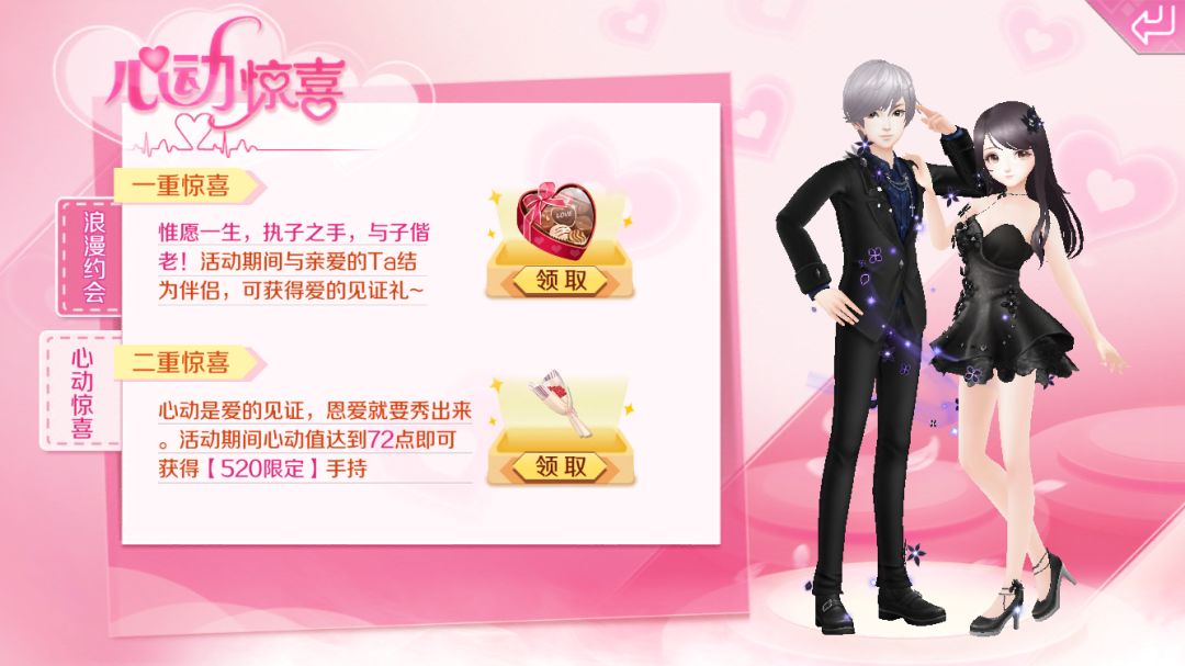 心动是爱的见证,恩爱就要秀出来,活动期间结为伴侣的情侣心动值达到72点即可获得【520限定】手持喔~