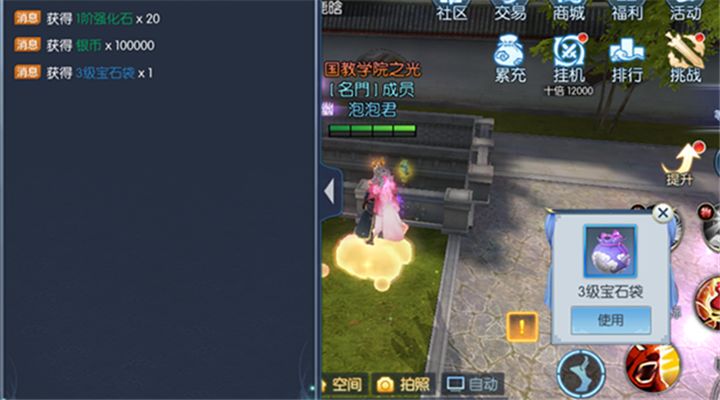 强化石可以用来对玩家的装备进行强化,装备强化等级的提升会对玩家的四维有所增强。银币是游戏通用的货币之一,使用银币玩家可以购买到很多提升自身修为的材料。其中价值最高的就是三级宝石袋了,通过三级宝石袋的开启玩家可以随机获得一个三级宝石,通过晶石镶嵌,三级宝石可以提升玩家不少的修为。