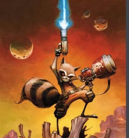 在漫画中,火箭浣熊原本是一只被基因改造过的浣熊,也是一名宇宙大盗。被同伴出卖被迫入狱,在监狱中结识了挚友—树人格鲁特。两人一起越狱后,成功加入了银河护卫队。