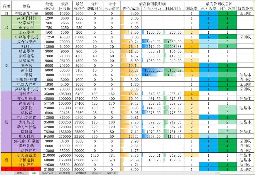 2.该表格是为了分析,在物品的回收价均接近各自的最高回收价时,集中资源生产哪些物品进行回收,获得的收益更高