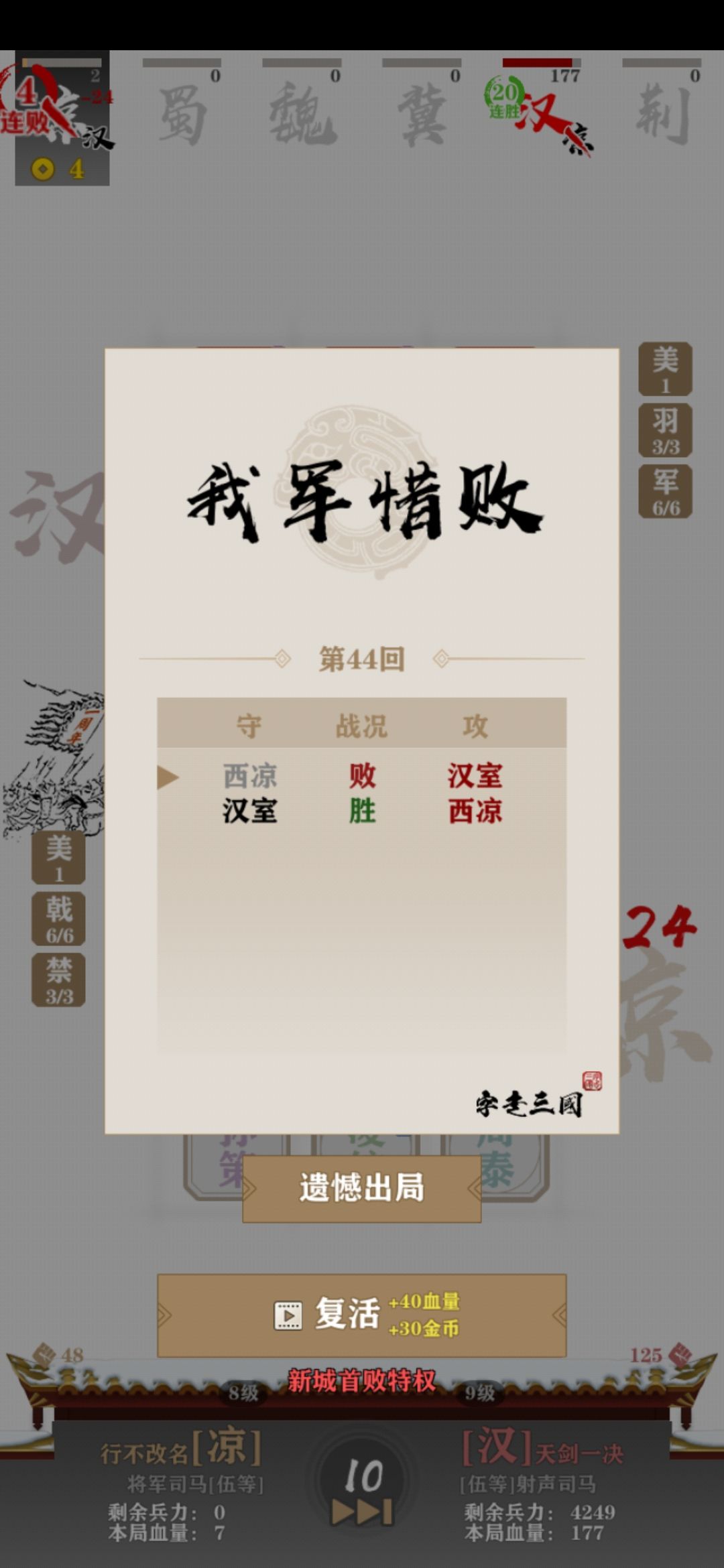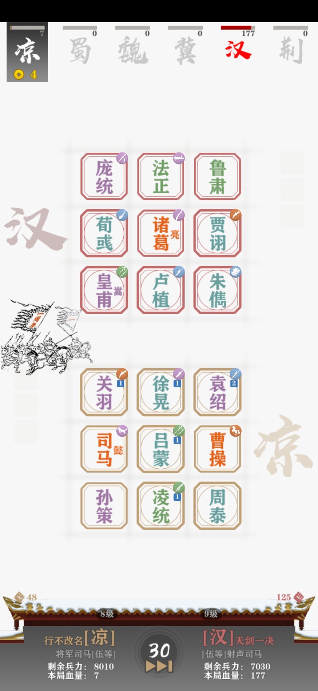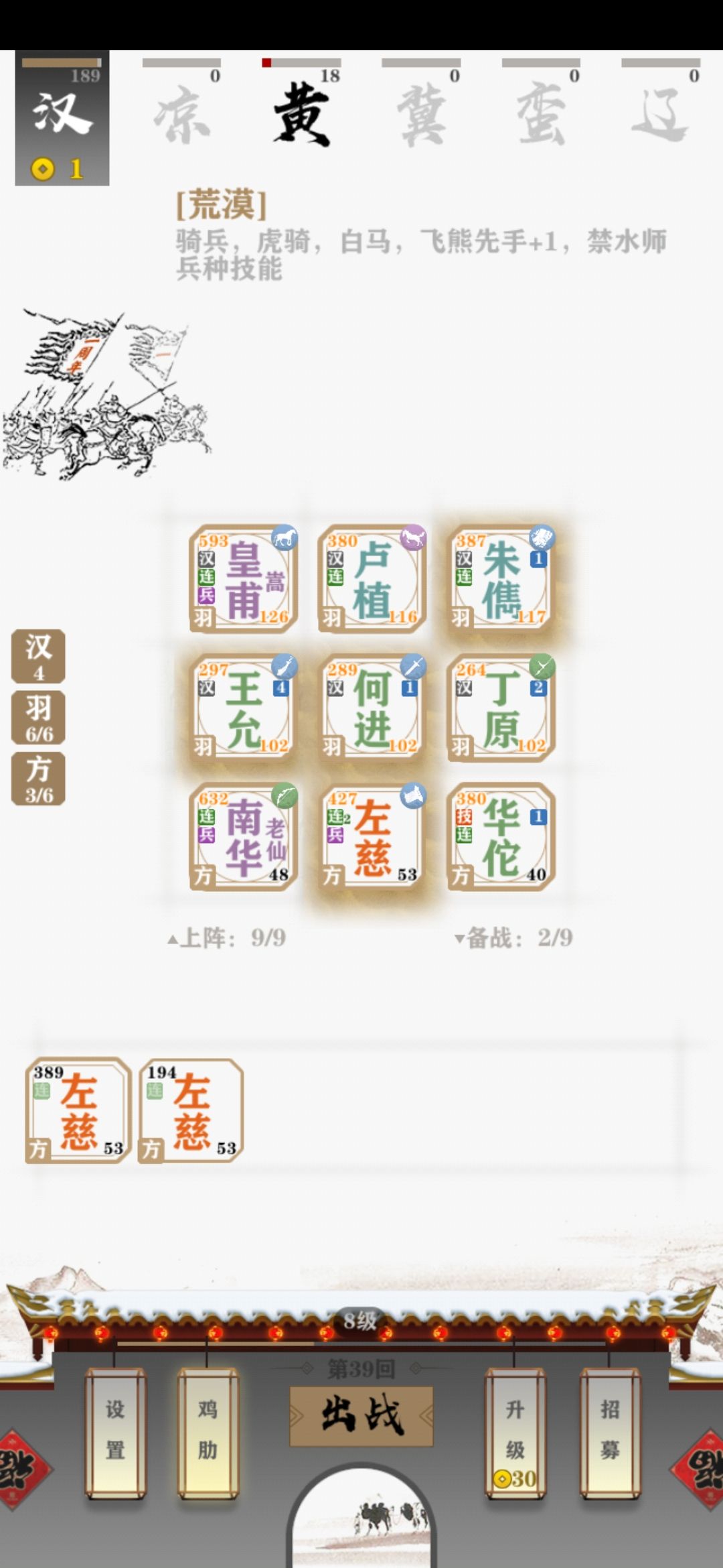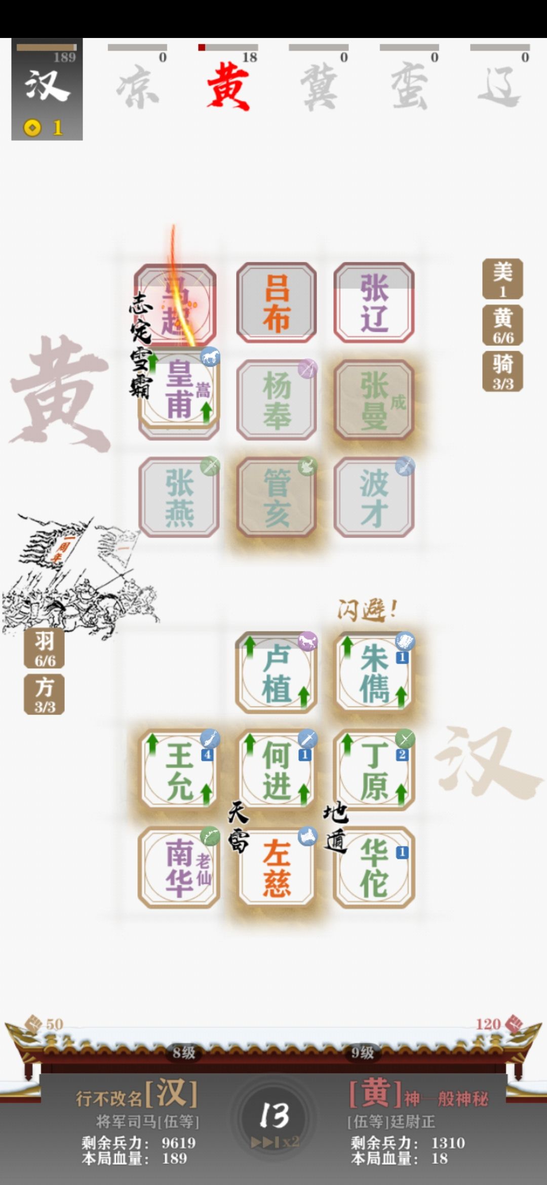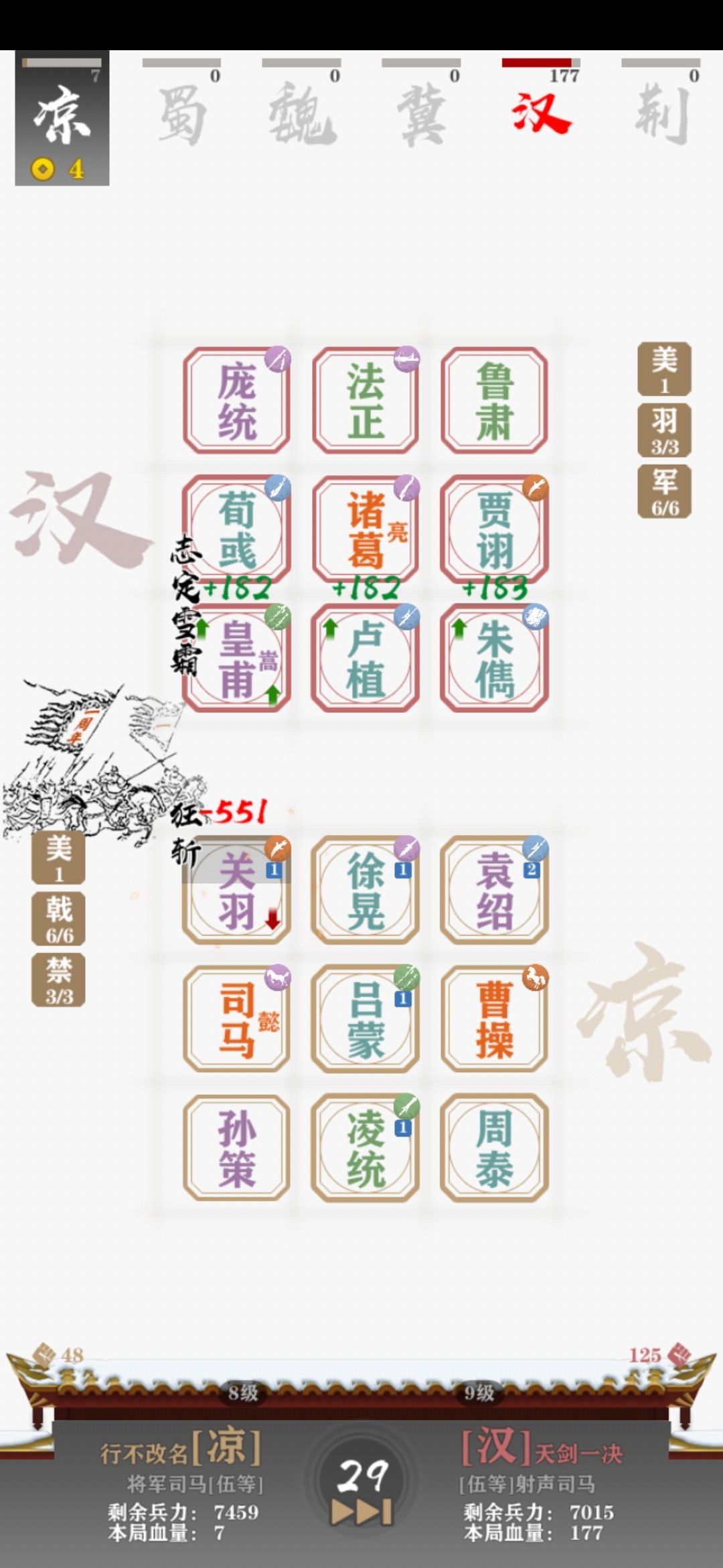 羽林军(or御林军)真是强的不讲道理,前中后完全没有弱势期,而且皇甫嵩比姜维的出现率感觉也好很多。统一全国路上,用六飞军三桃园和变阵的三飞军五虎刘备,被电脑的六羽三方吊打,我连电脑前排。前三张图是我的六戟三禁被电脑吊打,我的满级关羽被满级皇甫嵩锤一下,掉一半血。后两张是我用六羽吊打电脑