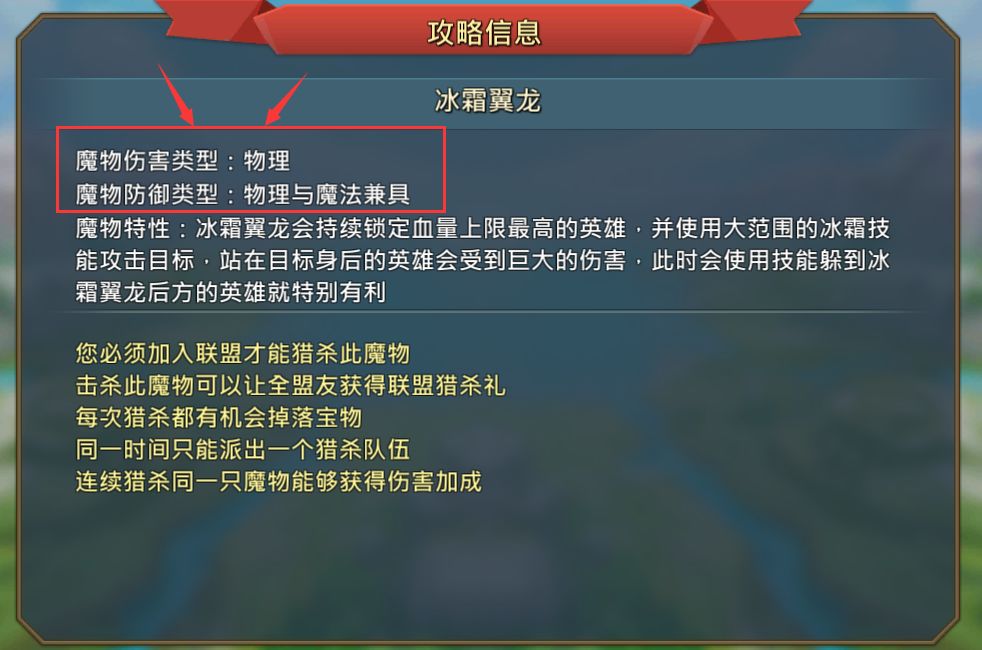 点击魔物猎杀时,先点击魔物左下角的 i 图标,查看他的防御和伤害类型,就可以根据这个选择相应的英雄出战。