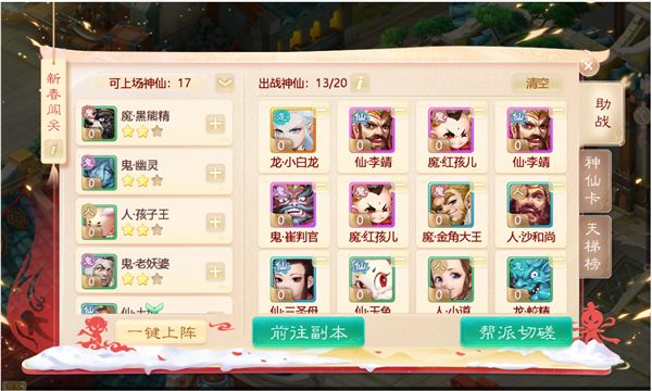 届时玩家在游戏中通过每日活跃度或副本通关收集请神符道具,就能召唤神仙助战,并可对神仙进行培养和搭配。玩家自主搭配神仙卡组后还可以进行切磋和每日对战,还能够在帮派频道组织“神仙擂台”,邀请帮派好友进行切磋。