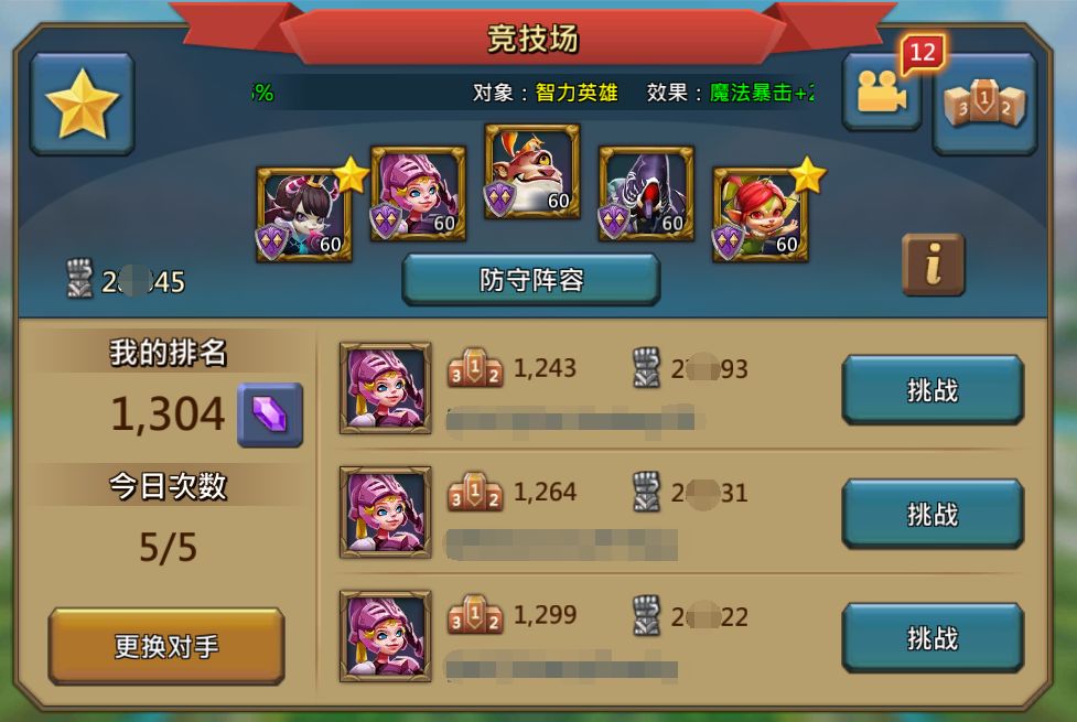竞技场挑战,每日有5次免费机会,机会用完就要花水晶购买。排名名次有对应的水晶奖励,奖励3小时发放一次。所以竞技场玩得好,也是水晶获得的一种绝佳途径。(具体参与规则可点击 i 图标查看)