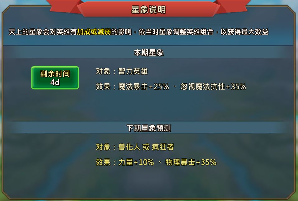 竞技场左上角的五角星,点击可查看当前星象,星象每周更新一次,可以根据星象搭配防守阵容和攻击阵容。