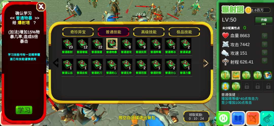 我的塔(4座45)级打32层(34层失败了一次)都感觉要完,学了普通物暴后轻松上40层,41层还是在发育一波,射程不够打不了,推荐使用最起码,没削弱前中期还是不错的(1-40层)