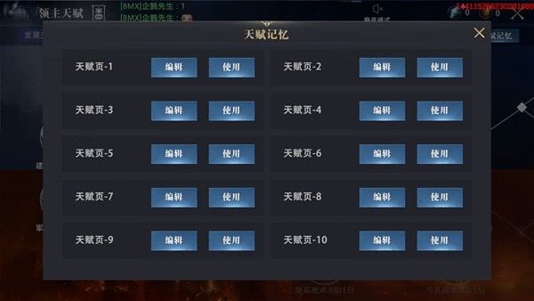领主在天赋页面点击天赋记忆,即可看到不同的天赋页,点击编辑可以预设不同方向的天赋页,并进行储存。
