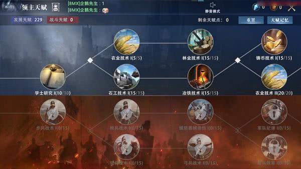 在天赋界面,领主可以看到发展天赋和战斗天赋两个分支,右上角则是重置、天赋记忆按钮。