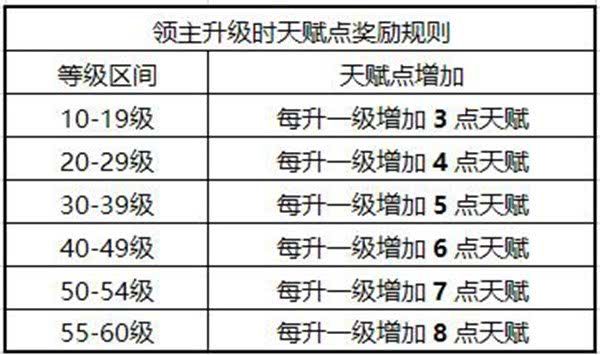 领主在学习天赋时,需要消耗一定的天赋点。天赋点是通过领主升级获得。领主等级达到1级时,可获得17点天赋。6级满级时可获得278点天赋。天赋点奖励规则如下: